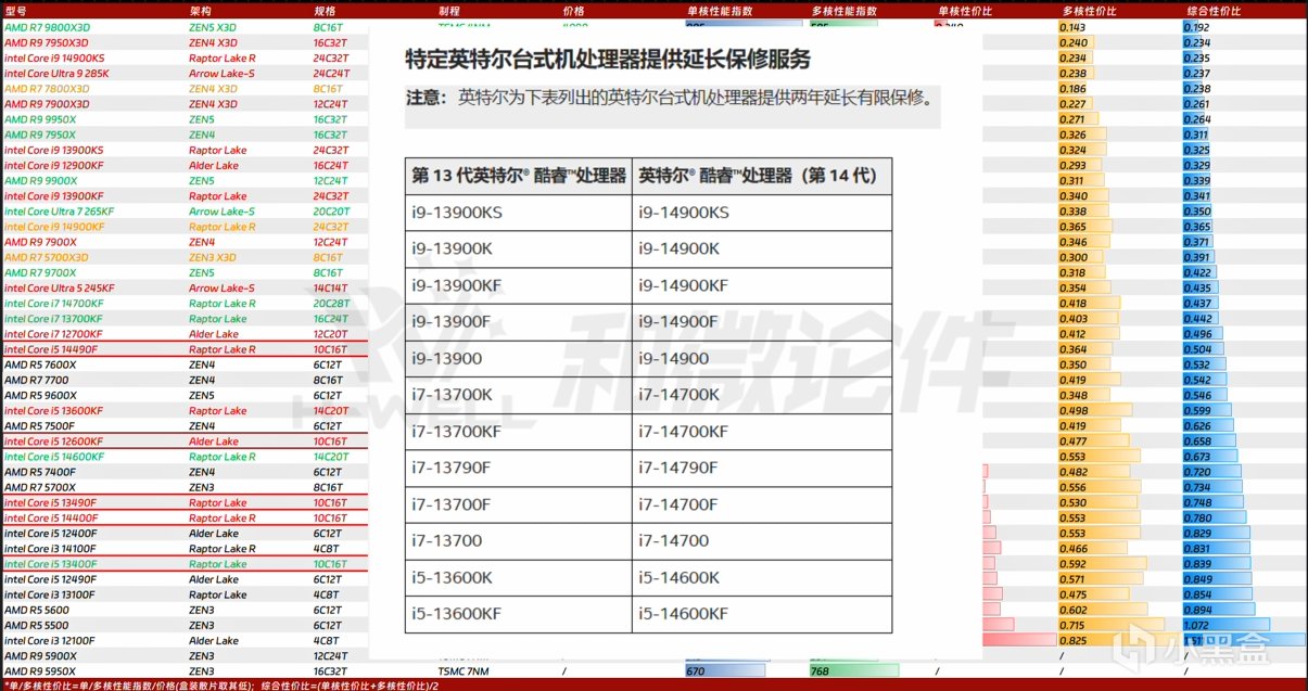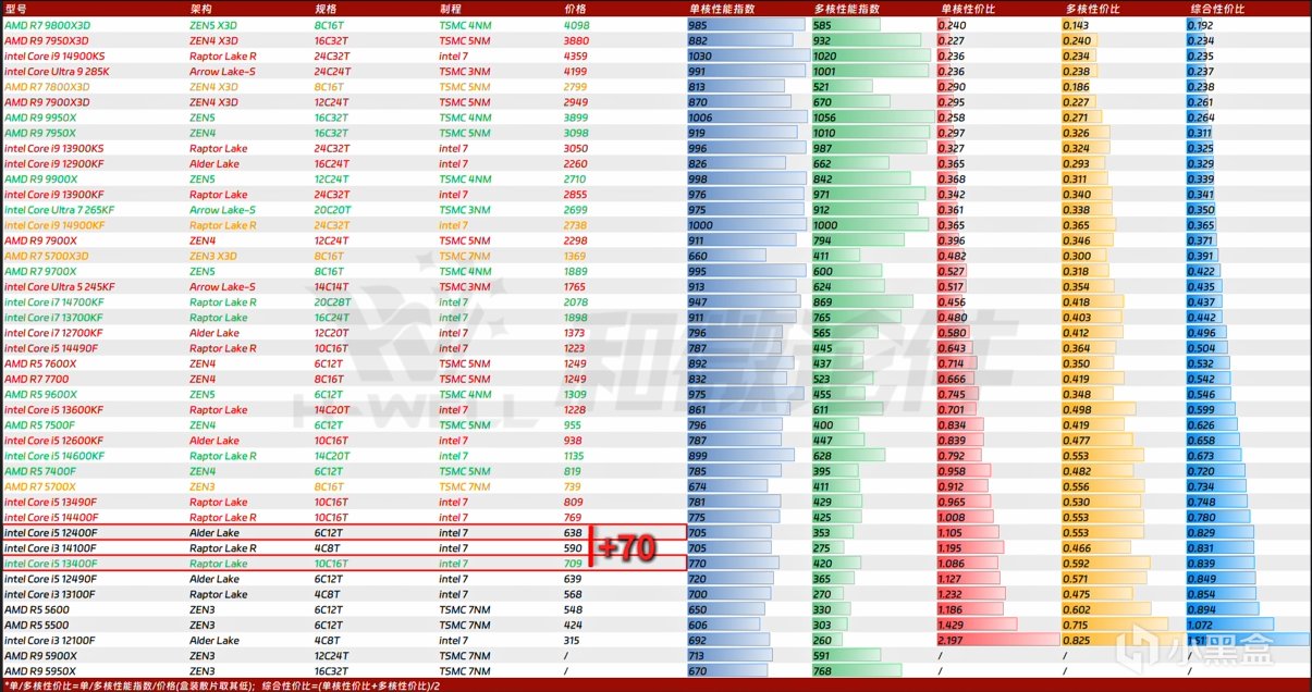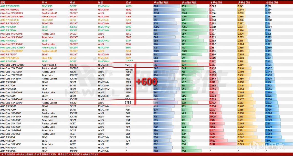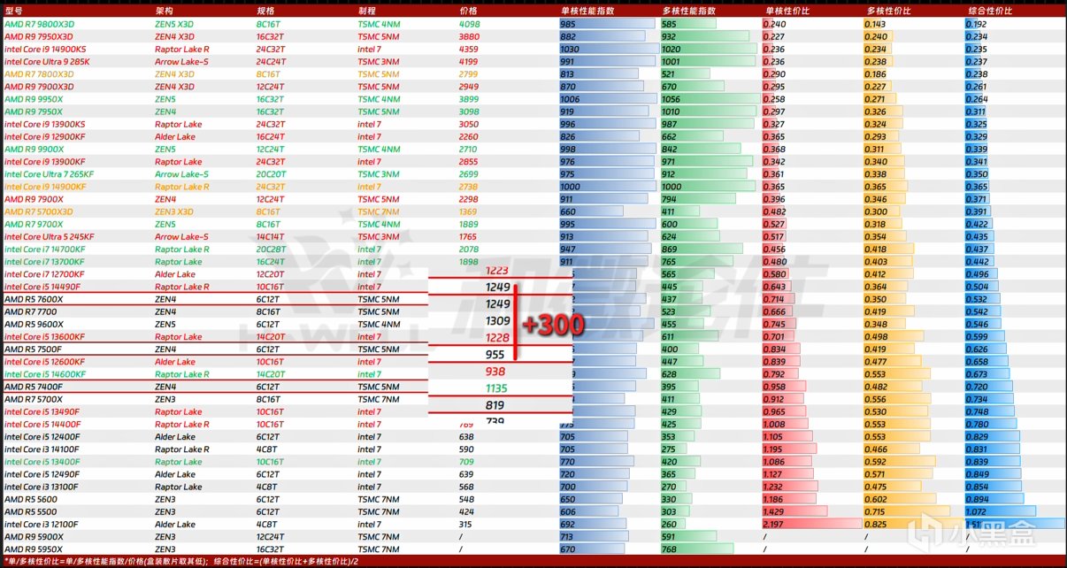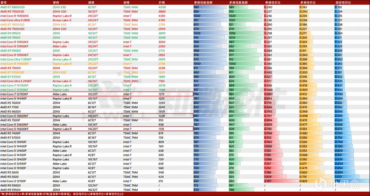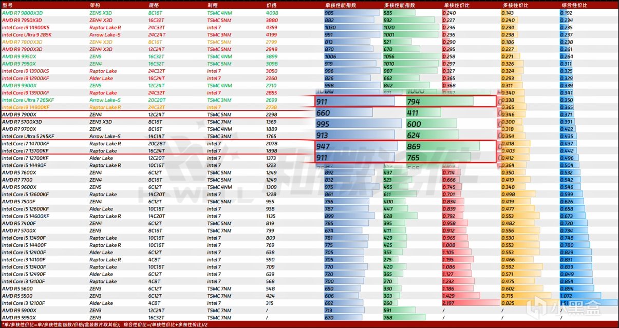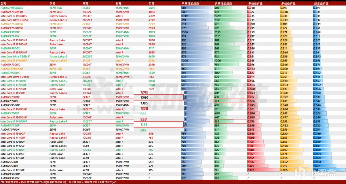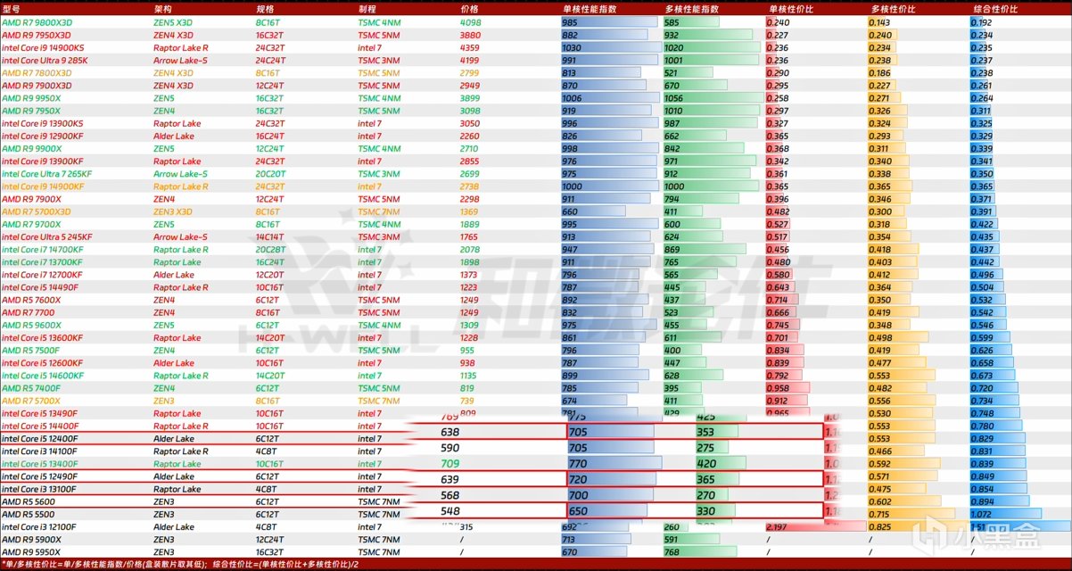 其他主流產品,我們就一起來細細梳理吧。這是綜合性價比排名圖,算法是前面的(單核性價比指數+多核性價比指數)/2,非常粗糙,但是沒關係,接下來我們一起使用人工冒泡排序法手法將它細化,一一糾察錯誤。性價比排名最低的,是來自AMD的9800X3D,因爲遊戲性能當世無敵,所以實際的性價比會比表格中高一點,價格方面,散片4100左右,相比上個月降低了300,如果你打算近期入手50系,我也不勸你等了,買了就買了吧,總體評價是 可以購買。