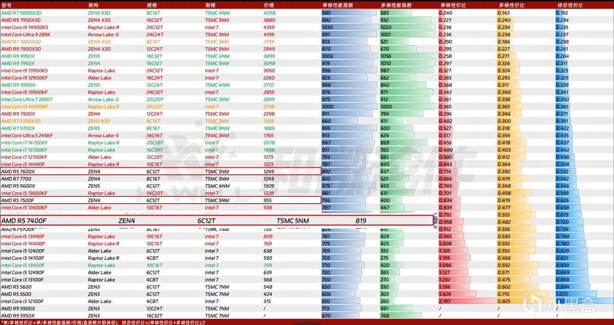 然後看看R5 7600X,這顆U,跟7600、7500F,7400F,是親兄弟。7600市面上找不到了,就不提了,在開啓PBO之後,他們性能幾乎一樣,所以,這裏的性價比指數在他們之間就沒有什麼意義了,直接對比價格即可