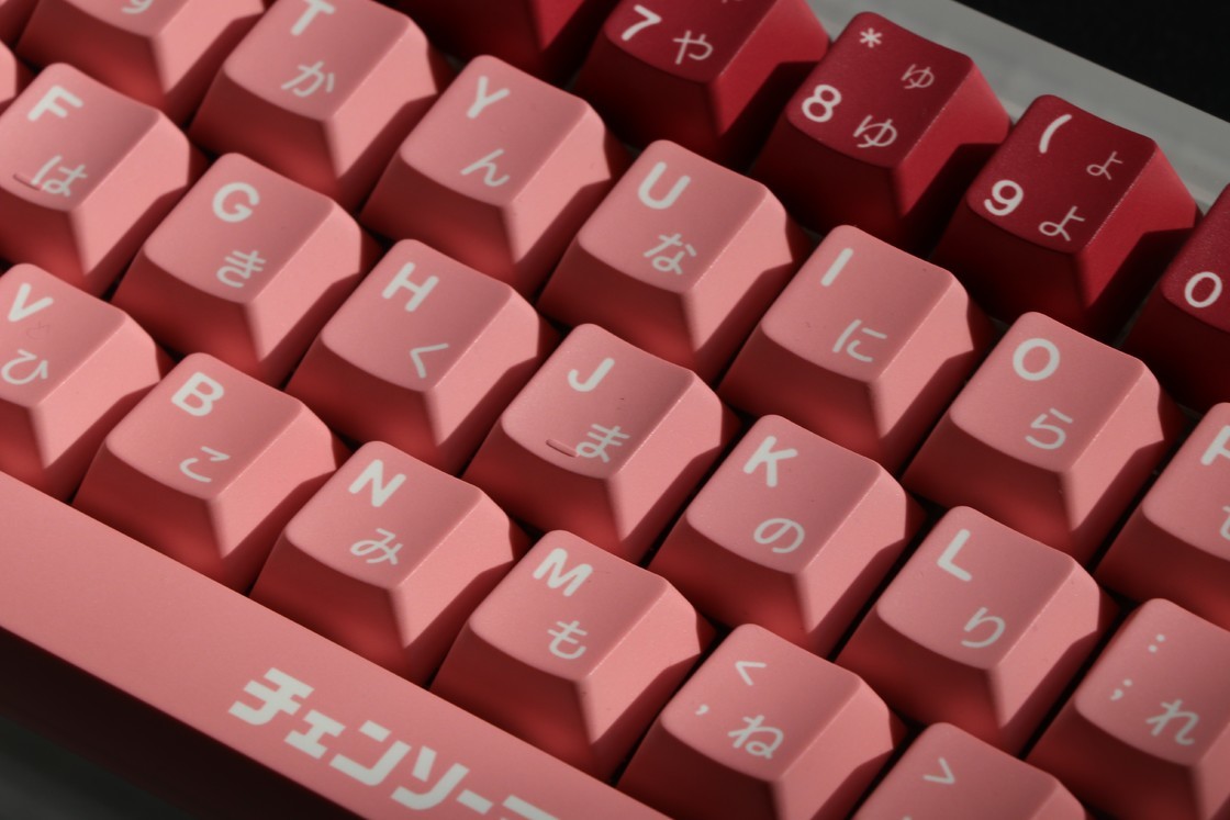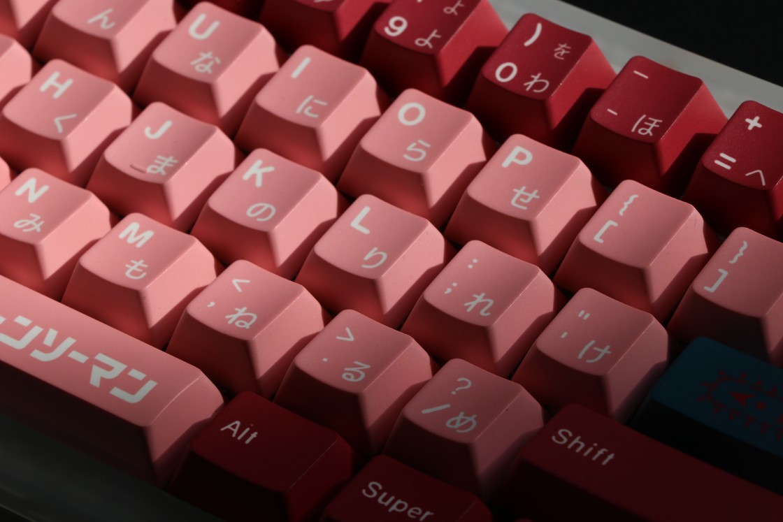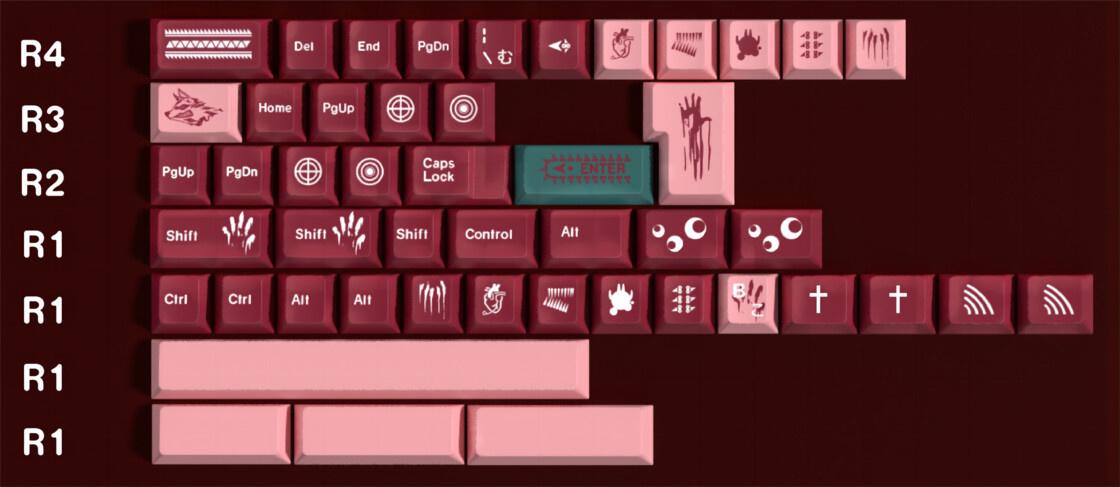配色方面,不同于以往很多以角色为原型的二次创作键帽取色模式,这款键帽并没有选取角色本身的服饰搭配和身体特征作为配色,而是以作品中大量出现的元素——血,作为颜色设计的来源,同时字母区的肉粉色和mod区血红色形成视觉上的对比,很有记忆点,绿色作为红色的互补色使得整体没有那么腻,衬得红色更红,绿色更绿。
