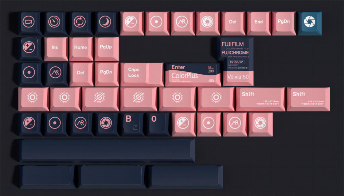 这款键帽的个性设计就是各种拍摄时用到的功能和信息,例如光圈调整、快门、曝光等,两个回车则是柯达和富士胶卷暗盒的包装变换而来。