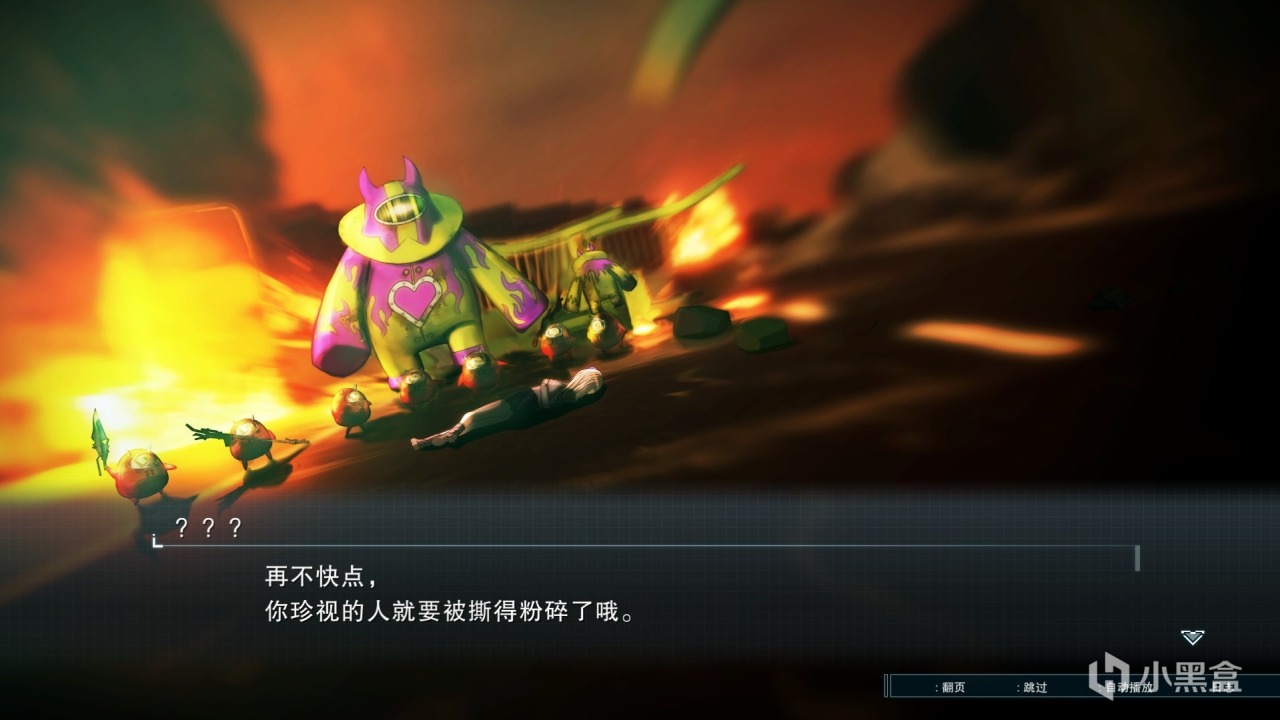 然後發現各種巨型詭異玩具在大肆屠殺人類,妹子(嘉琉亞)倒在地上,白熊給了男主一把奇奇怪怪的刀,他說:你用它插自己的心臟,就能獲得和怪物抗衡的戰鬥力!