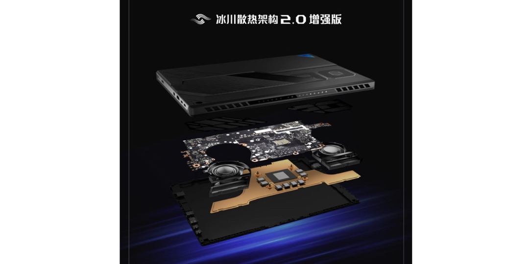 爲了這兩顆處理器,ROG重新設計了PCB,PCB層數達到了14層,並配備了14相供電,同時使用冰川散熱架構2.0增強版爲處理器進行散熱。新散熱系統使用雙向內吹設計,增大進氣和出氣口面積,且使用液金導熱和不鏽鋼複合均熱板,保證筆記本高負載時運行穩定。