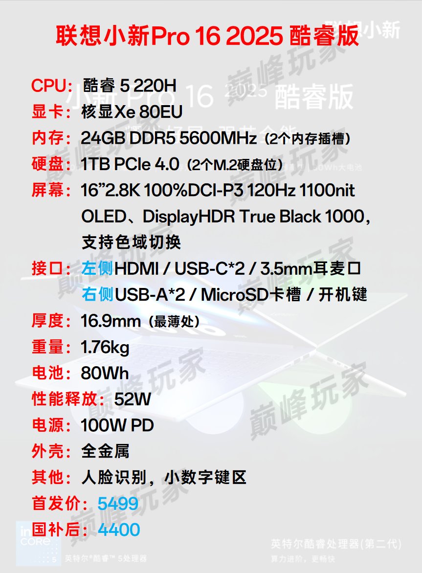 Core 5 220H / 24GB / 1TB,首發5499,國補後4400