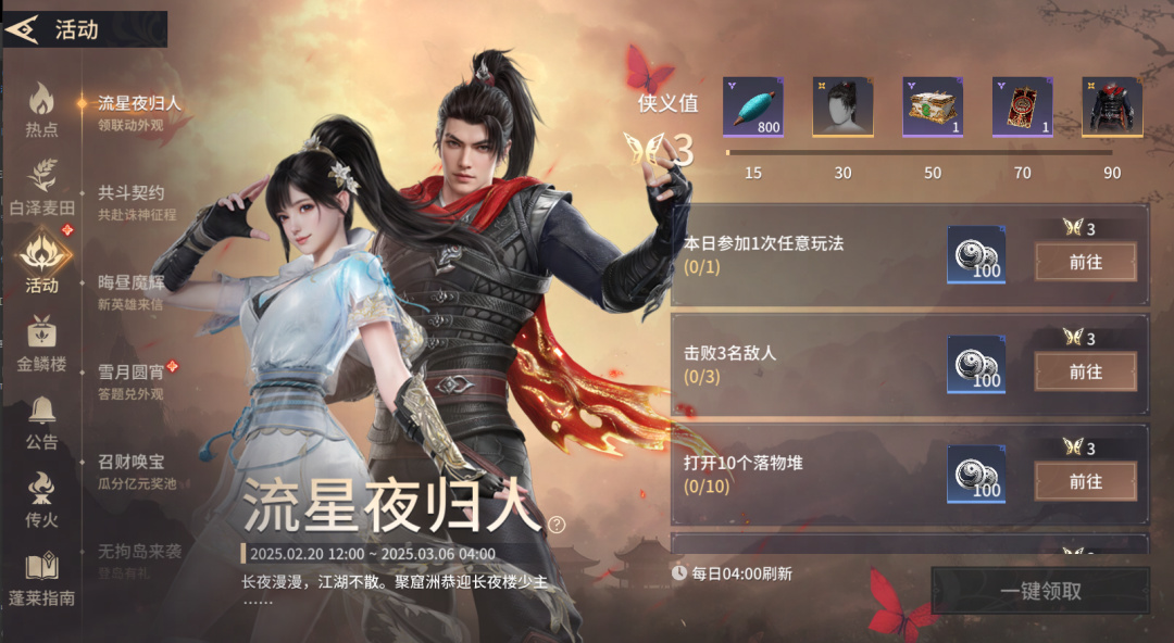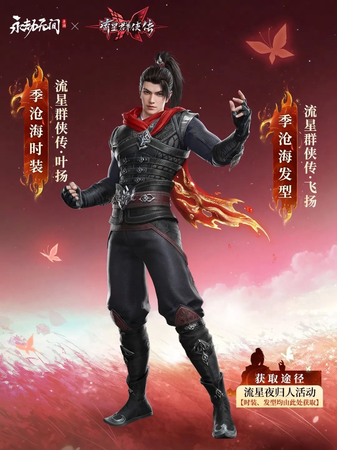 限時活動【流星夜歸人】即將同步開啓,完成任務即可獲得季滄海時裝【流星羣俠傳·葉揚】及配套髮型【流星羣俠傳·飛揚】,更有瑞霖寶箱等多重獎勵。