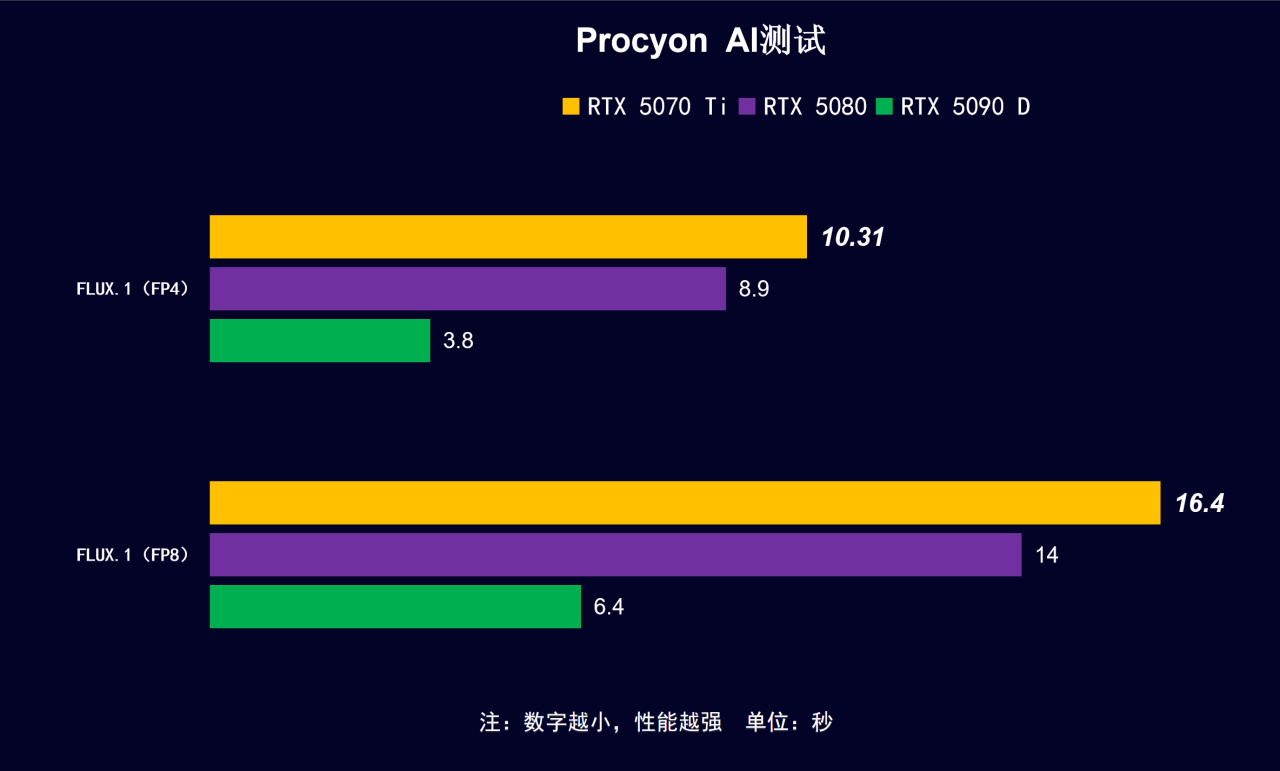 Procyon AI測試,FP4測試比5080 落後14%左右,FP8測試落後17%左右