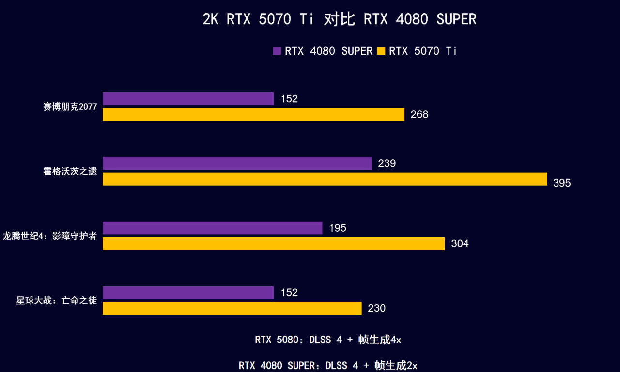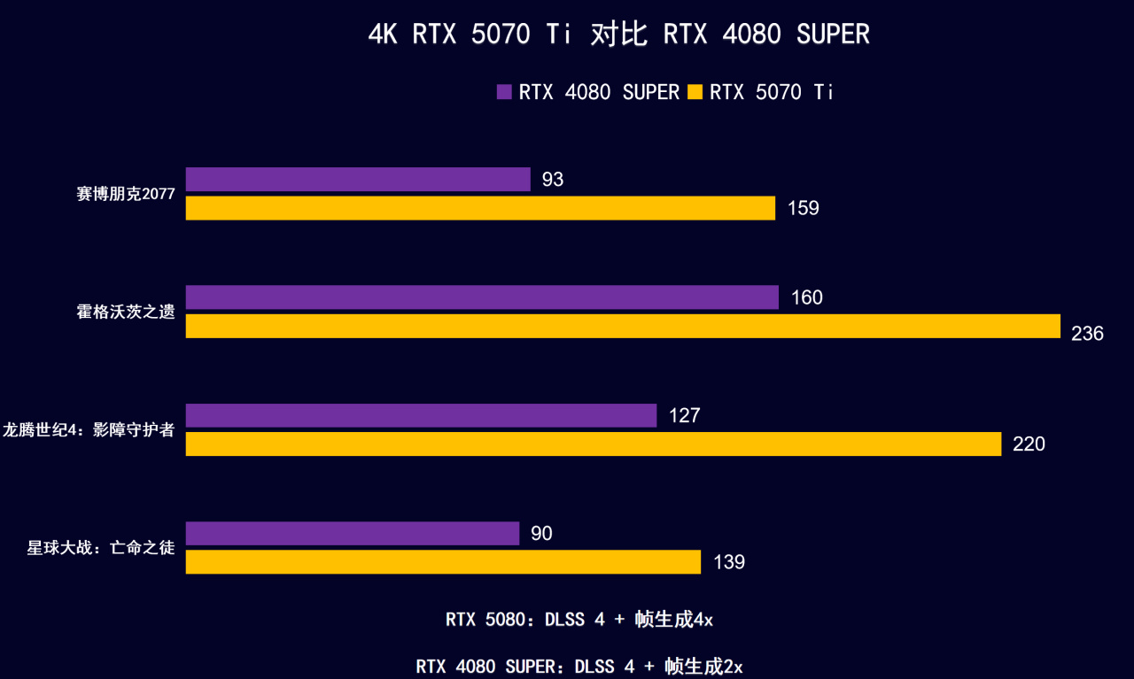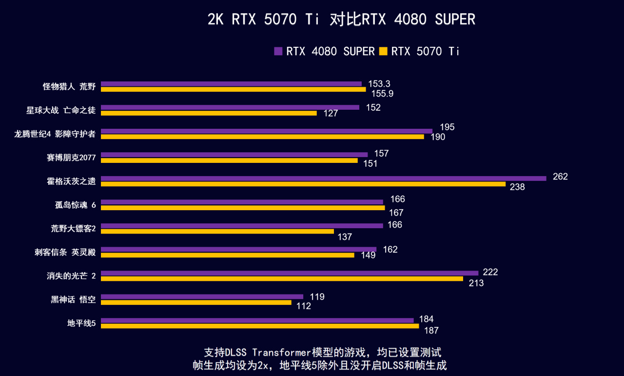 RTX 5070Ti對比4080SUPER,不開DLSS 4的4倍插幀,兩款顯卡的遊戲性能差不多,光追遊戲5070Ti稍微領先。