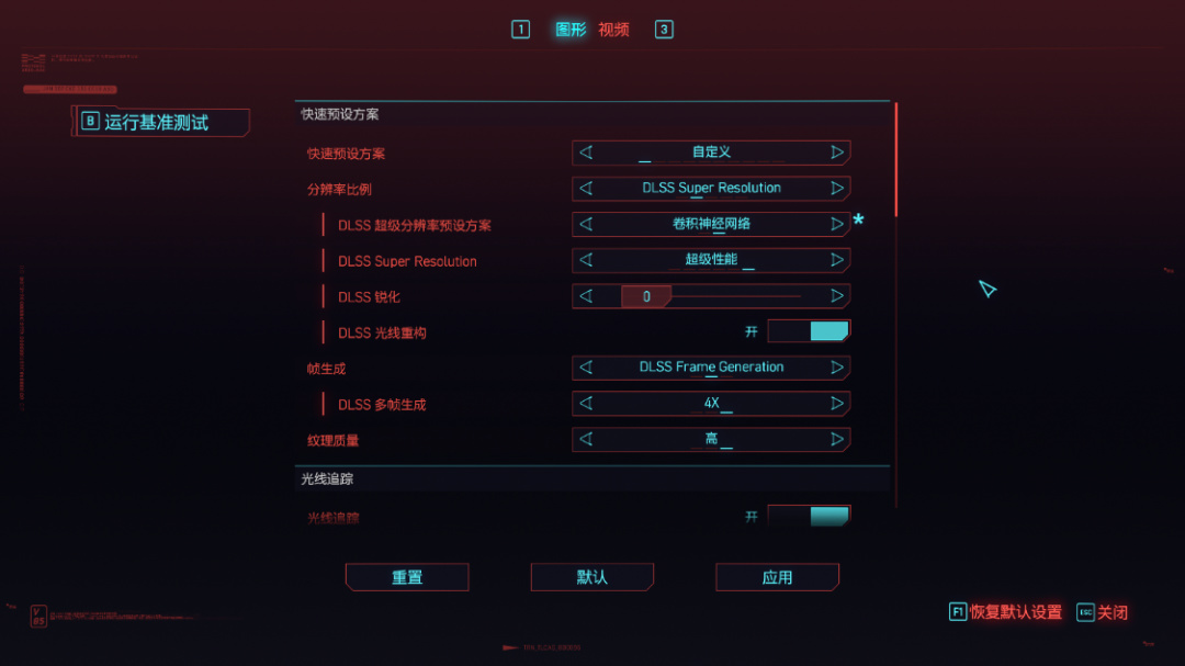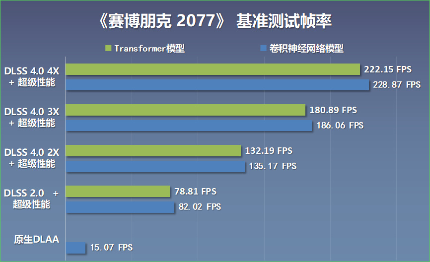 作爲目前唯一開放了DLSS 4.0支持的遊戲,在《賽博朋克2077》基準測試中,將畫質設爲超級,光追設爲路徑追蹤模式,4K分辨率下,開啓原生DLAA時,遊戲平均幀率爲15.07 FPS。開啓DLSS 2.0,並設爲超級性能模式,在使用卷積神經網絡模型時,遊戲平均幀率爲82.02 FPS。在使用Transformer模型時,遊戲平均幀率爲78.81 FPS。開啓DLSS 幀生成,並將多幀生成倍率設爲2X,在使用卷積神經網絡模型時,遊戲平均幀率爲135.17 FPS。在使用Transformer模型時,遊戲平均幀率爲132.19 FPS。將多幀生成倍率設爲3X後,在使用卷積神經網絡模型時,遊戲平均幀率爲186.06 FPS。在使用Transformer模型時,遊戲平均幀率爲180.89 FPS。將多幀生成倍率設爲4X後,在使用卷積神經網絡模型時,遊戲平均幀率爲228.87 FPS。在使用Transformer模型時,遊戲平均幀率爲222.15 FPS。