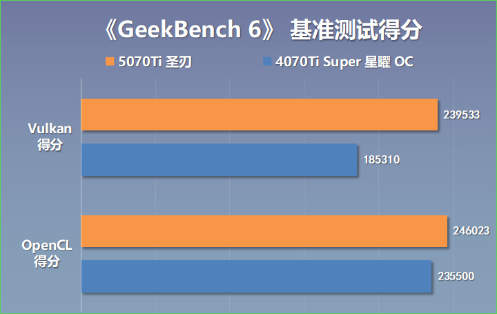 而在最新版的GeekBench 6顯卡測試中,在OpenCL測試中,顯卡得分246023分。在Vulkan測試中,顯卡得分239533分;