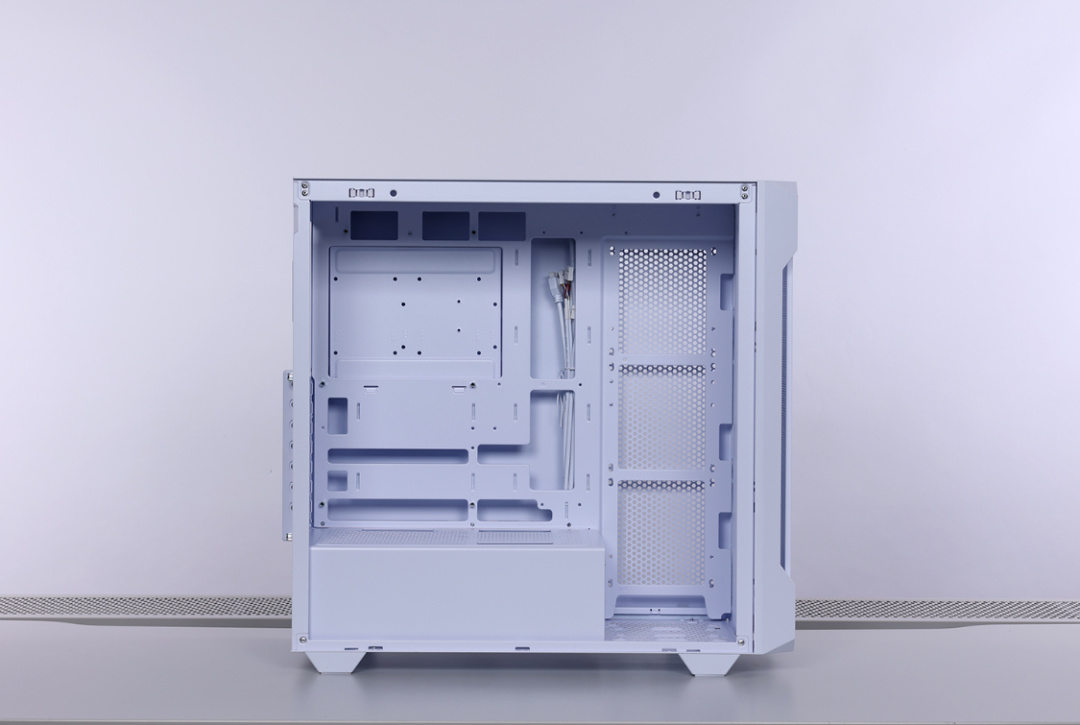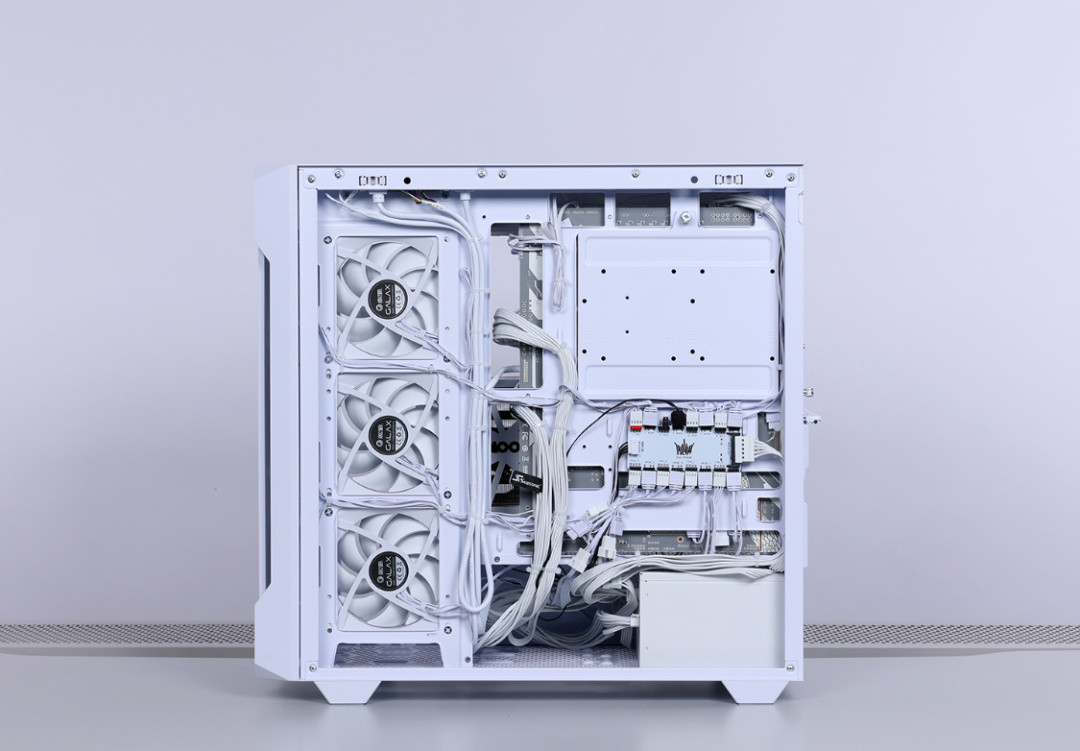 機箱兩塊側板均採用球形卡扣 + 卡榫的固定方式,拆裝方便。玻璃側板還增加了手擰螺絲加固設計。兼容性方面,機箱最大支持E-ATX主板,並支持ATX/M-ATX背插主板,顯卡安裝限長425mm,並支持豎裝,風冷限高175mm,支持頂置360水冷安裝,至多可安裝13把散熱風扇。