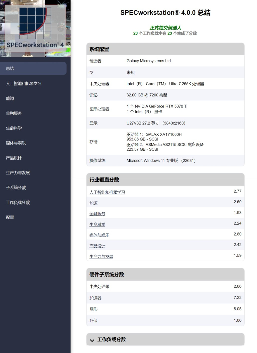 SPECworkstation® 4.0.0是SPEC最新發布的硬件生產力測試,這套測試軟件可以測試出CPU、顯卡等硬件在應對AI人工智能、能源、金融、設計、傳媒等不同行業生產力需求時,可以帶來多少性能表現。經過測試,這套以RTX 5070Ti聖刃顯卡爲核心的平臺,在AI人工智能與深度學習行業軟件測試中得分2.77分,在能源行業軟件測試中得分2.60分,在金融行業軟件測試中得分1.93分,在生命科學行業軟件測試中得分2.24分,在媒體娛樂行業軟件測試中得分2.80分,在產品設計行業軟件測試中得分2.42分,在生產力與發展行業軟件測試中得分1.59分;