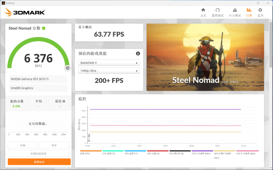 Steel Nomad基準測試可以測試出電腦在4K分辨率下,遊玩非光追遊戲時的性能表現。顯卡得分爲6376分;