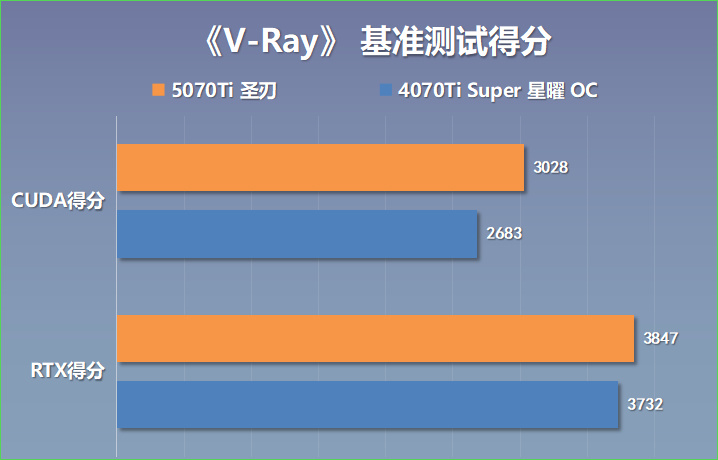 V-Ray作爲目前主流的3D渲染插件,廣泛應用於建築、廣告、電影電視等行業在進行視覺特效製作的過程中,該插件可以測試顯卡在渲染實時光追以及特效渲染速度的性能。顯卡在CUDA渲染測試中,得分爲3028分,RTX光追渲染測試得分3847分;