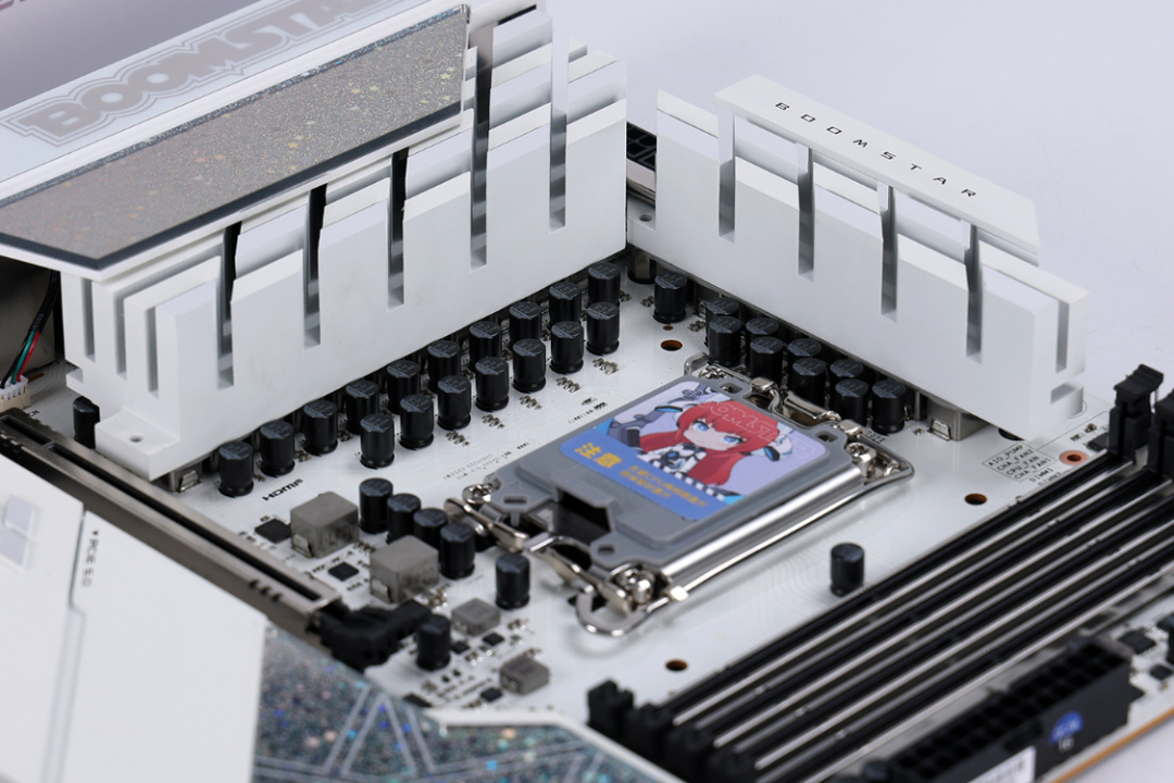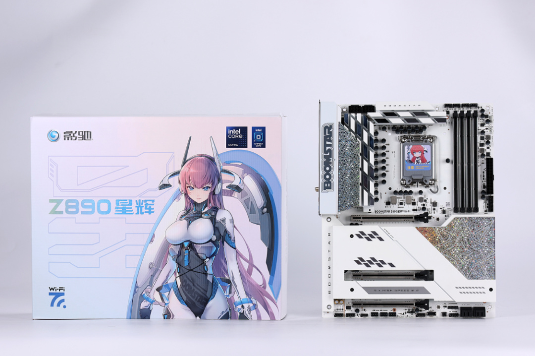 主板當然得是影馳全新發布的星曜Z890星輝WIFI主板。ATX規格,白色PCB板表面配備了大面積金屬散熱裝甲,且同樣以白色爲主。此外,裝甲表面還有一些金屬CNC切削工藝處理過的菱形亮面,設計感十足。南橋和供電模組位置散熱裝甲表面還採用可替換磁吸模塊設計,DIY屬性拉滿。