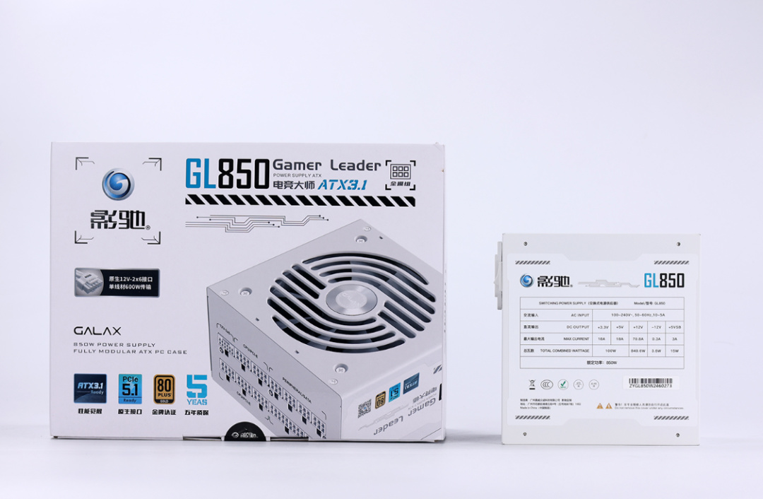 電源方面,選擇的是影馳GL-850 ATX 3.1 金牌全模組電源,全白配色,140mm短機身設計,符合最新的ATX3.1、PCIe5.1標準,採用的是全臺系高品質105度耐溫電容,通過80plus金牌認證,原生搭載12V-2x6顯卡供電接口,可以完美滿足RTX40/50系顯卡供電需求。同時,電源還支持5年質保。
