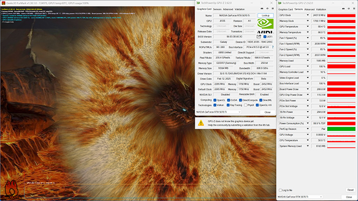 FurMark烤機測試,室溫24°,機箱內環境,烤機15 Min後,顯卡功耗300W左右,顯卡溫度69°左右;
