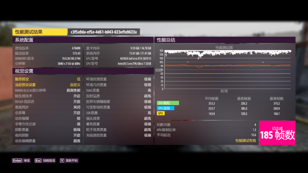 《極限競速·地平線5》基準測試,極端畫質,極端光追,開啓DLSS 3.0並設爲超級性能模式,4K分辨率下,遊戲平均幀數185FPS;