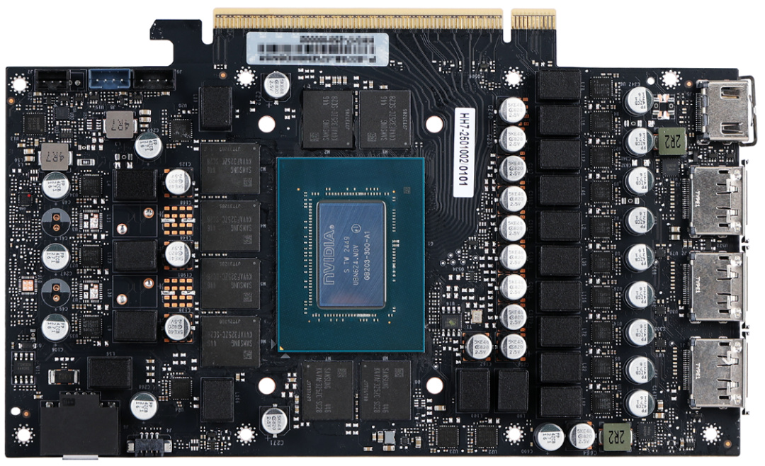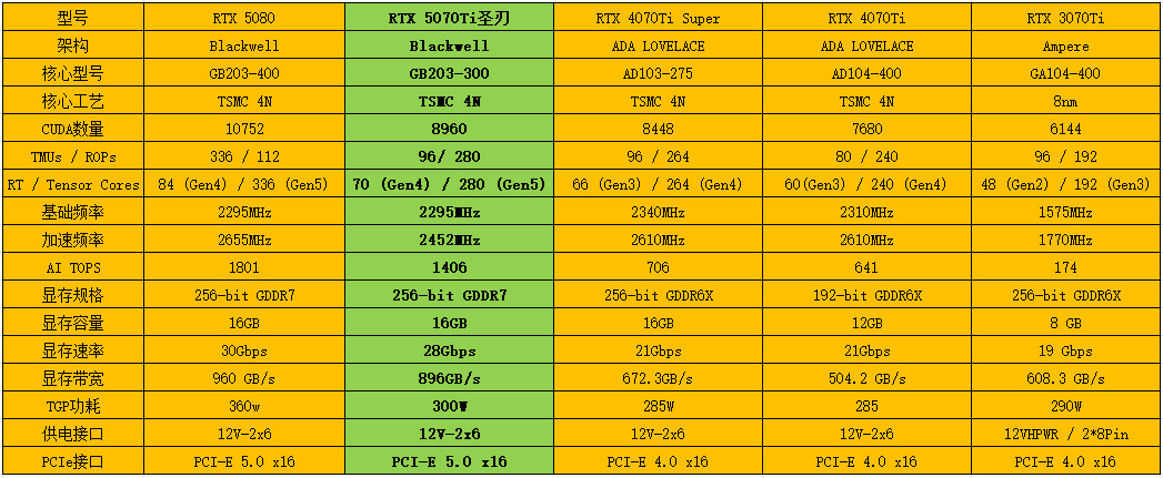 5070Ti聖刃顯卡,採用12層非公版PCB設計,擁有10+4+3相供電,顯卡核心是NVIDIA Blackwell架構的GB203-300核心,旁邊環繞着的是8顆三星GDDR7高速顯存,單顆2GB大小,總容量爲16GB,擁有256-bit顯存位寬。