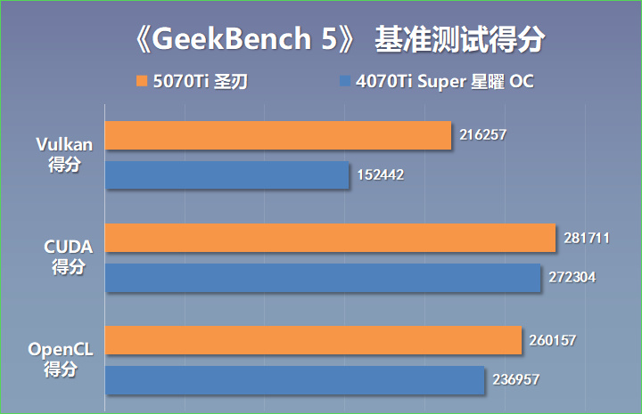 通過GeekBench 5顯卡測試,我們可以測試出顯卡在處理不同的GPU硬件加速計算模型時的性能表現。在OpenCL測試中,顯卡得分260157分。在CUDA測試中,顯卡得分281711分。在Vulkan測試中,顯卡得分216257分;