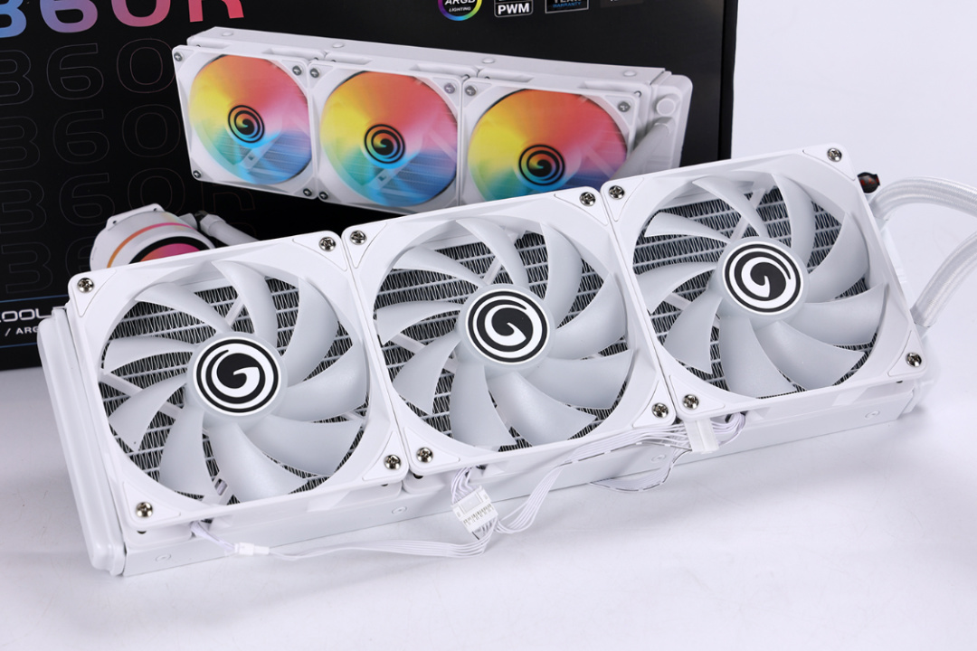 標配三把120規格的ARGB散熱風扇,採用一線通的接線方式,理線方便。三把風扇均支持PWM調速,最大可達1600±200RPM的轉速,搭配上9片高強度流線型扇葉,每把風扇最大可提供71.5 CFM的風量和2.45 mmH2O的風壓,而滿載運行時的噪音僅爲31分貝。