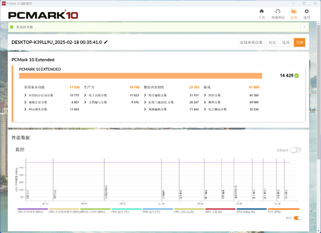 PC Mark Extended整機測試,整機得分14429分,常用基本功能測試得分測試11636分,生產力得分10768分,數爲內容創作得分22363分,遊戲得分41800分;