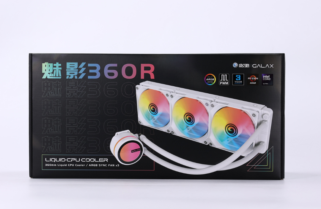而散熱方面,我們選擇的同樣是影馳新品,魅影360R 白色一體式水冷。圓形冷頭設計,頂部是一塊可旋轉的鏡面頂蓋,並配備ARGB燈效。冷頭內部採用了一顆高性能靜音水泵,最大轉速可達2800RPM±10%,而滿載運行時的噪音僅爲30分貝。搭配上400mm的高密度水冷管,可以大大提高水冷內部的冷熱交換效率,提升水冷的散熱表現。大面積純銅底座,並貼心的採用了預塗硅脂的設計。