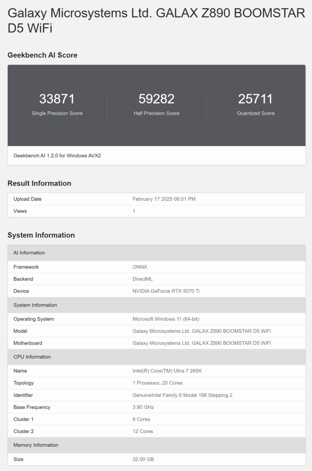 目前Stable Diffusion暫不支持50系顯卡,因此使用GeekBench推出的GeekBench AI基準測試,測試顯卡的AI性能,顯卡在單精度測試中得分33871分,在半精度測試中得分59282分,在量化神經網絡測試中得分25711分;