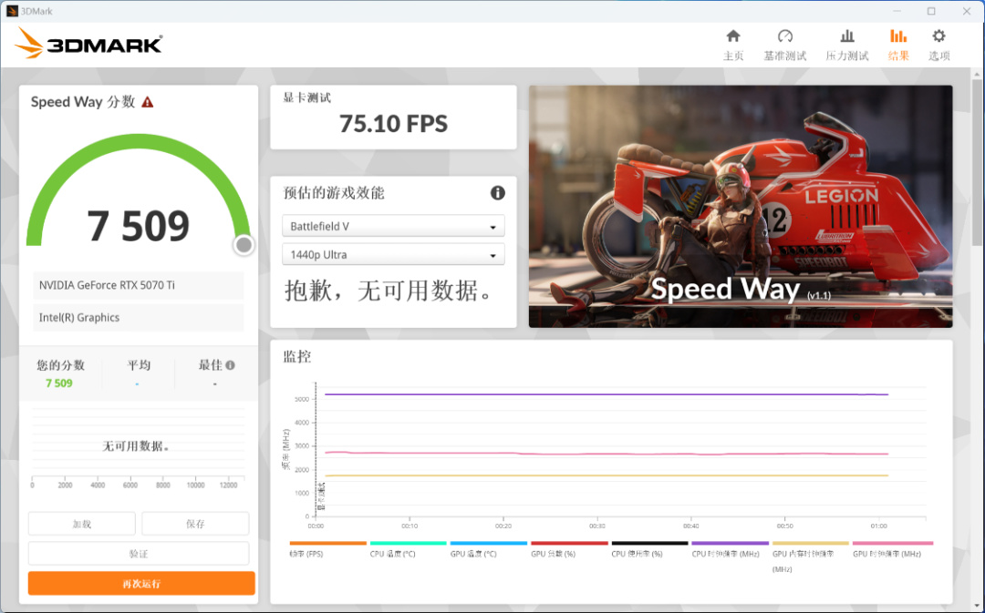 Speed Way基準測試可以測試出顯卡等硬件在基於DirectX 12 圖形API中,渲染實時光追、網格着色器等場景時的性能表現。顯卡得分7509分;