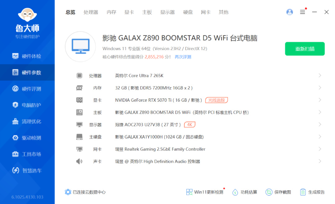 魯大師整機測試得分302.4W分,RTX 5070Ti聖刃顯卡得分99.8W分;