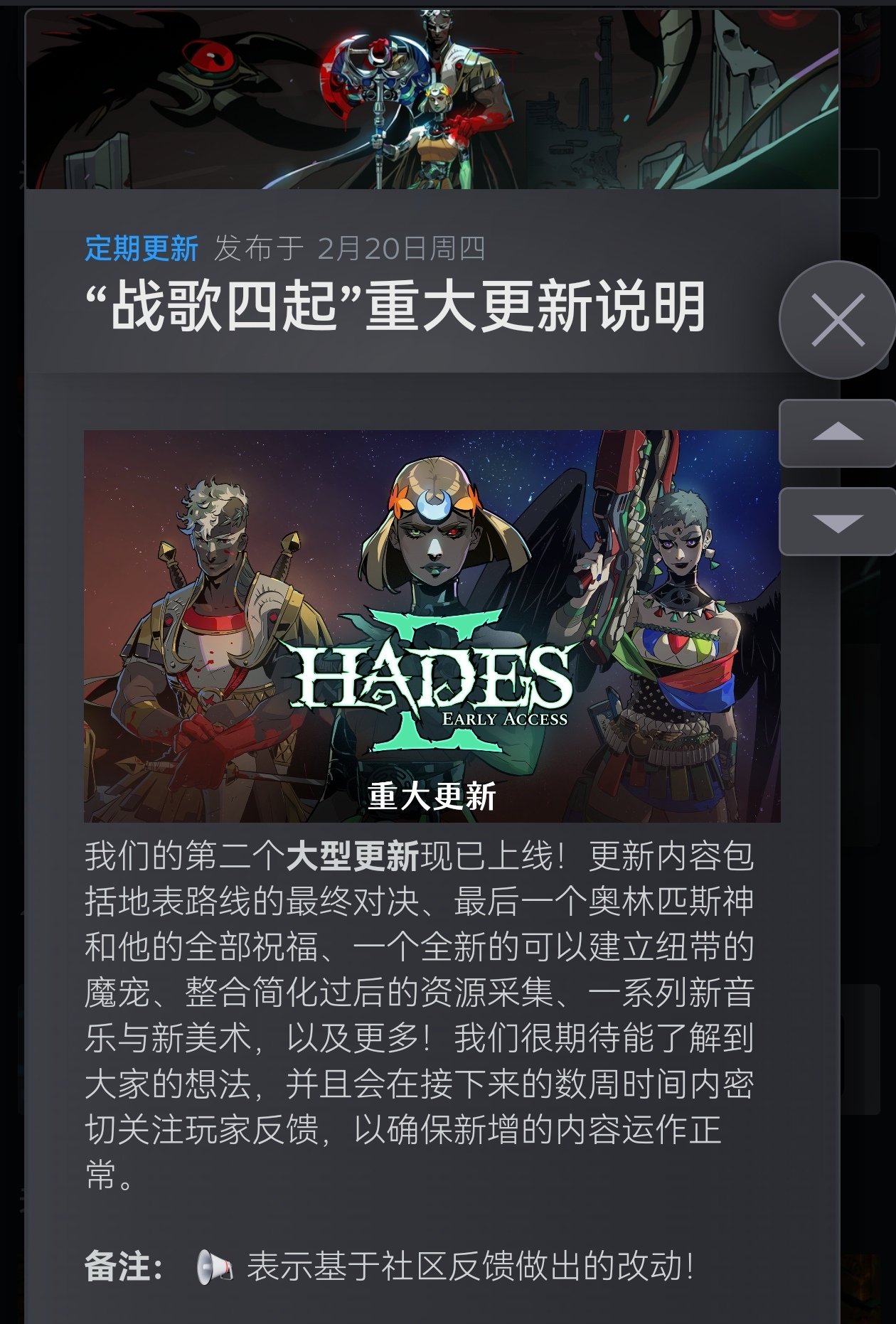 大家好,今天廠商Supergiant Games官方正式爲《哈迪斯2》推出了第二個大更新,主要就是新增了戰神這個神還有就是地表路線的最終決戰,這個更新內容確實很大很大,甚至我感覺這個更新完,正式版都快出了,因爲最終決戰都出來了,正式版還會遠嘛。
