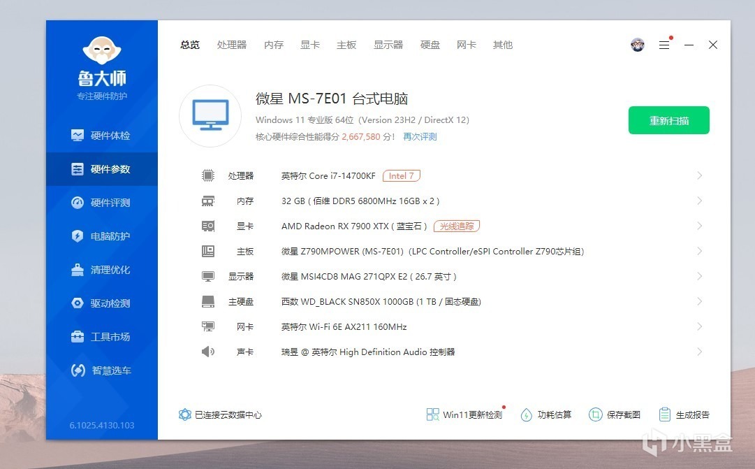 我們看下電腦配置,CPU是英特爾i7-14700KF,內存是佰維16GBx2 ,顯卡是藍寶石RX 7900XTX,主板是微星的Z790MPOWER。