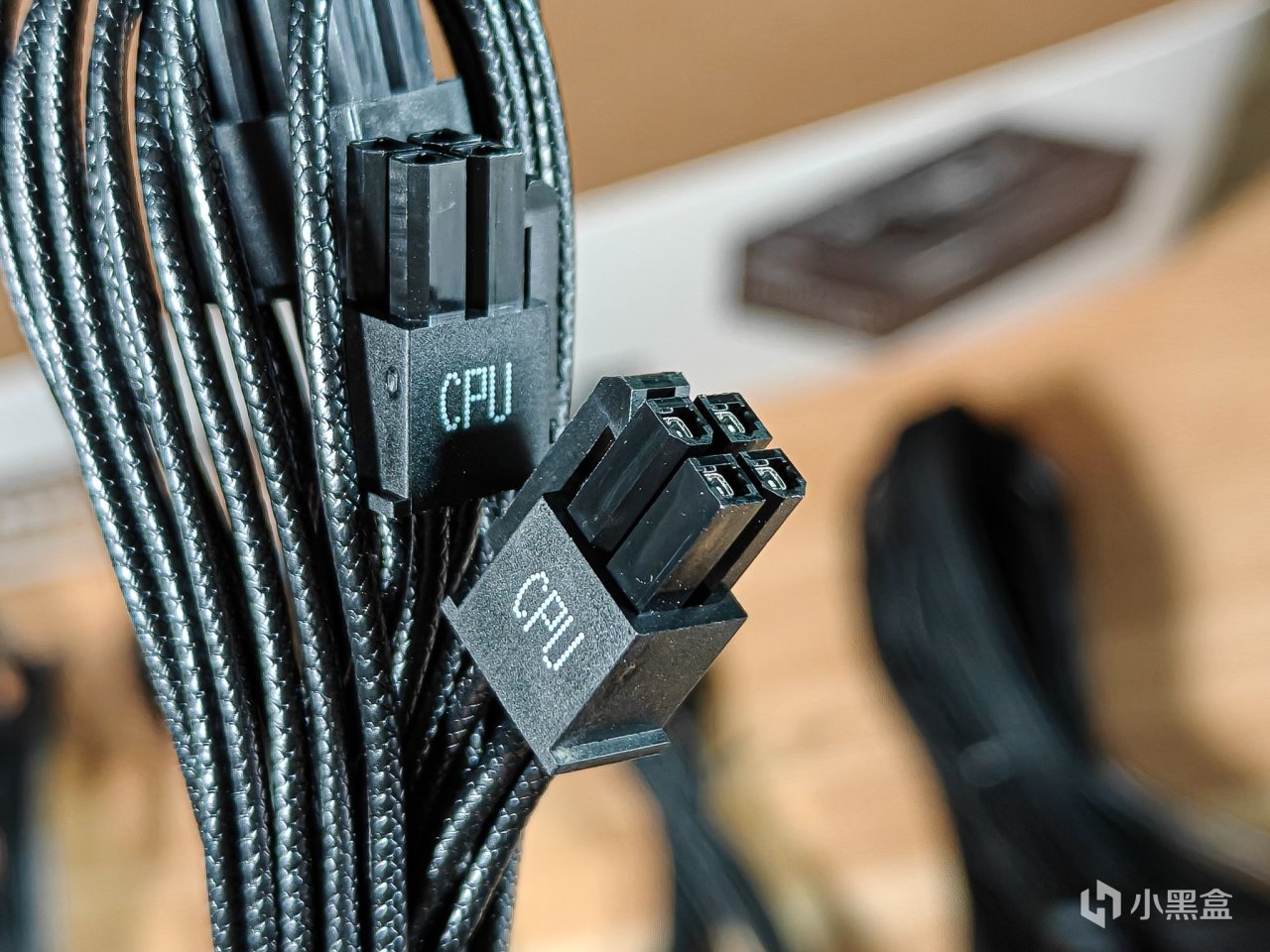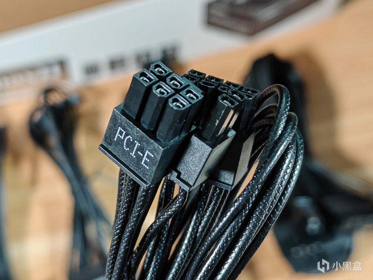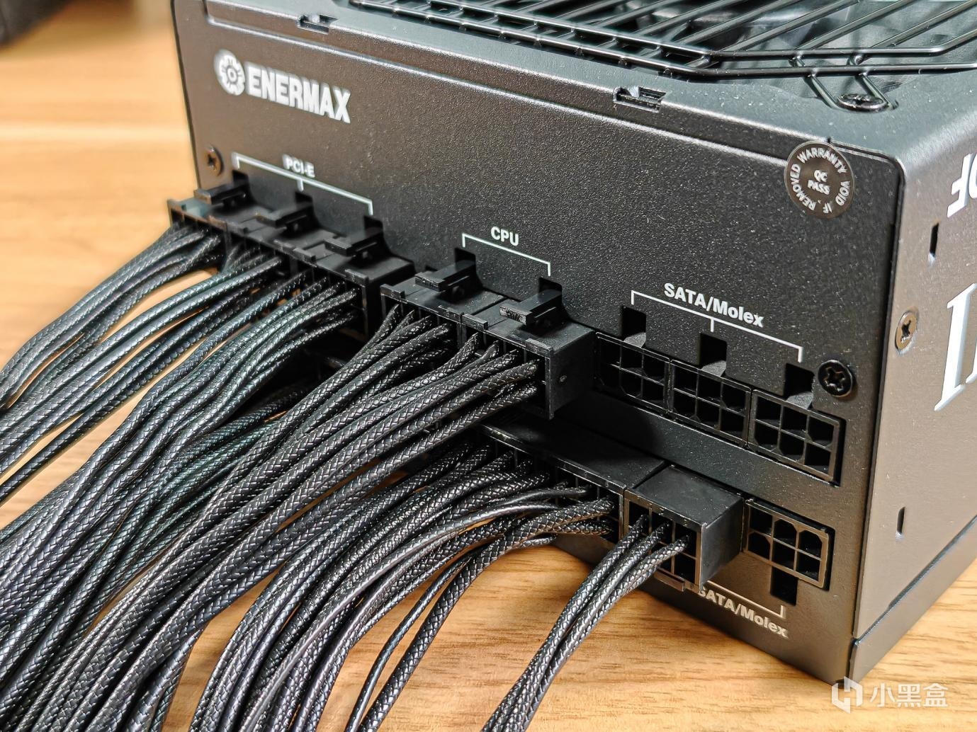 這款電源是全模組電源,電源的各種接口分爲2排,並且有明顯清晰的標記。上面一排如上圖從左到右分別爲3個PCI-E 8孔接口,2個CPU 8孔接口,3個SATA/Molex 6孔接口。下面一排從左到右分別爲1個 PCI-E 8孔接口,一個直供顯卡,支持ATX 3.1標準的12V-2x6接口,14+18的主板接口,2個SATA/Molex接口。接口豐富,各種應用綽綽有餘。
