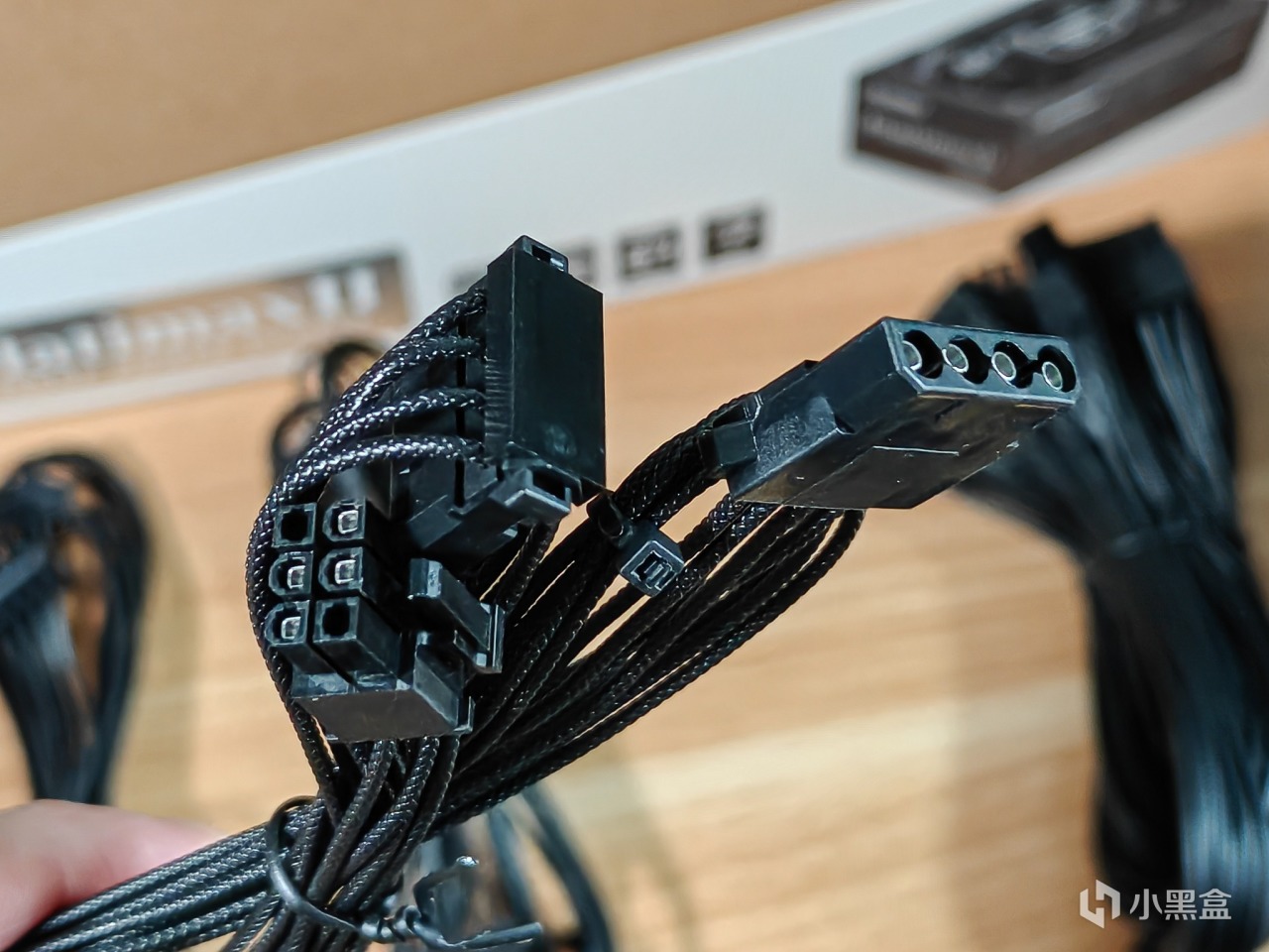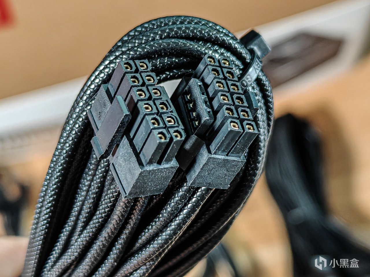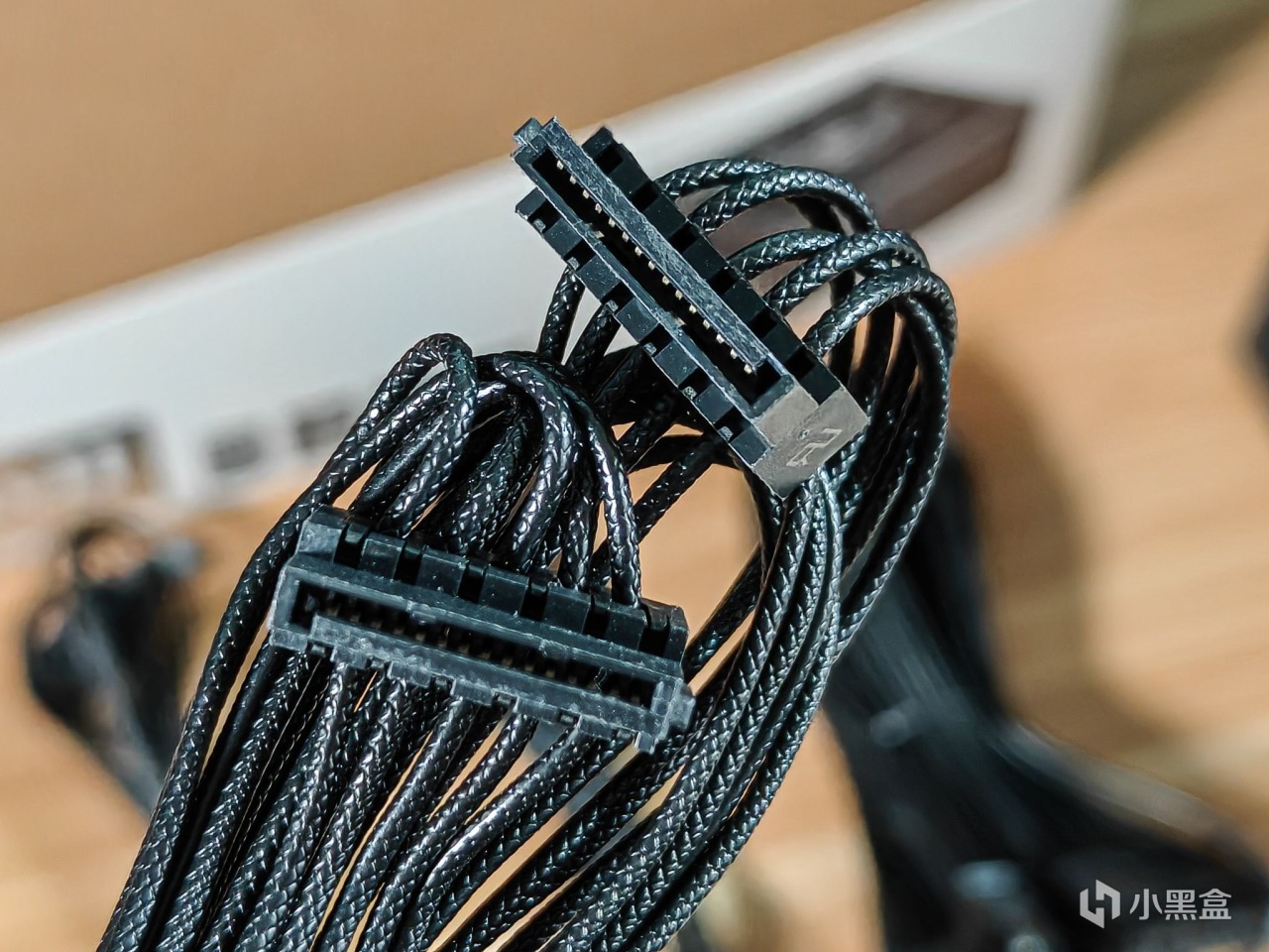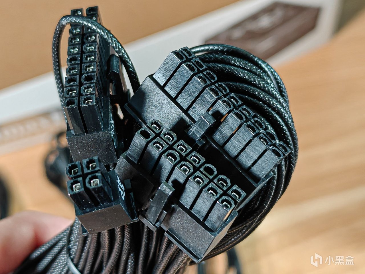 這款電源是全模組電源,電源的各種接口分爲2排,並且有明顯清晰的標記。上面一排如上圖從左到右分別爲3個PCI-E 8孔接口,2個CPU 8孔接口,3個SATA/Molex 6孔接口。下面一排從左到右分別爲1個 PCI-E 8孔接口,一個直供顯卡,支持ATX 3.1標準的12V-2x6接口,14+18的主板接口,2個SATA/Molex接口。接口豐富,各種應用綽綽有餘。