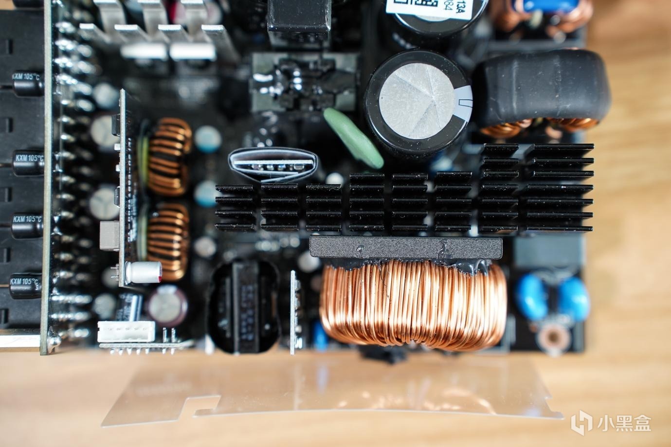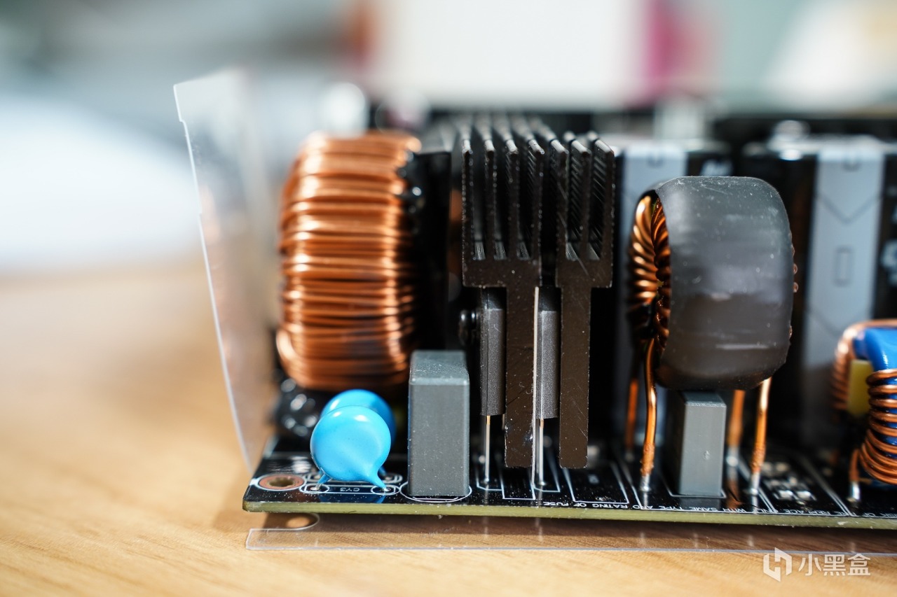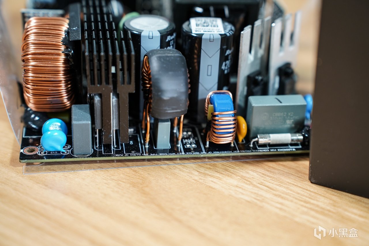 擰掉若干螺絲將電源打開,打開蓋子。帶有風扇的頂蓋一側有透明塑料,上面還有開口。這樣的設計爲了調節風向,從而得到最好的冷卻效果。電路部分非常齊整,兩側有透明塑料片隔離絕緣,電源採用了主動式PFC+全橋LLC諧振+同步整流+DC-DC結構。