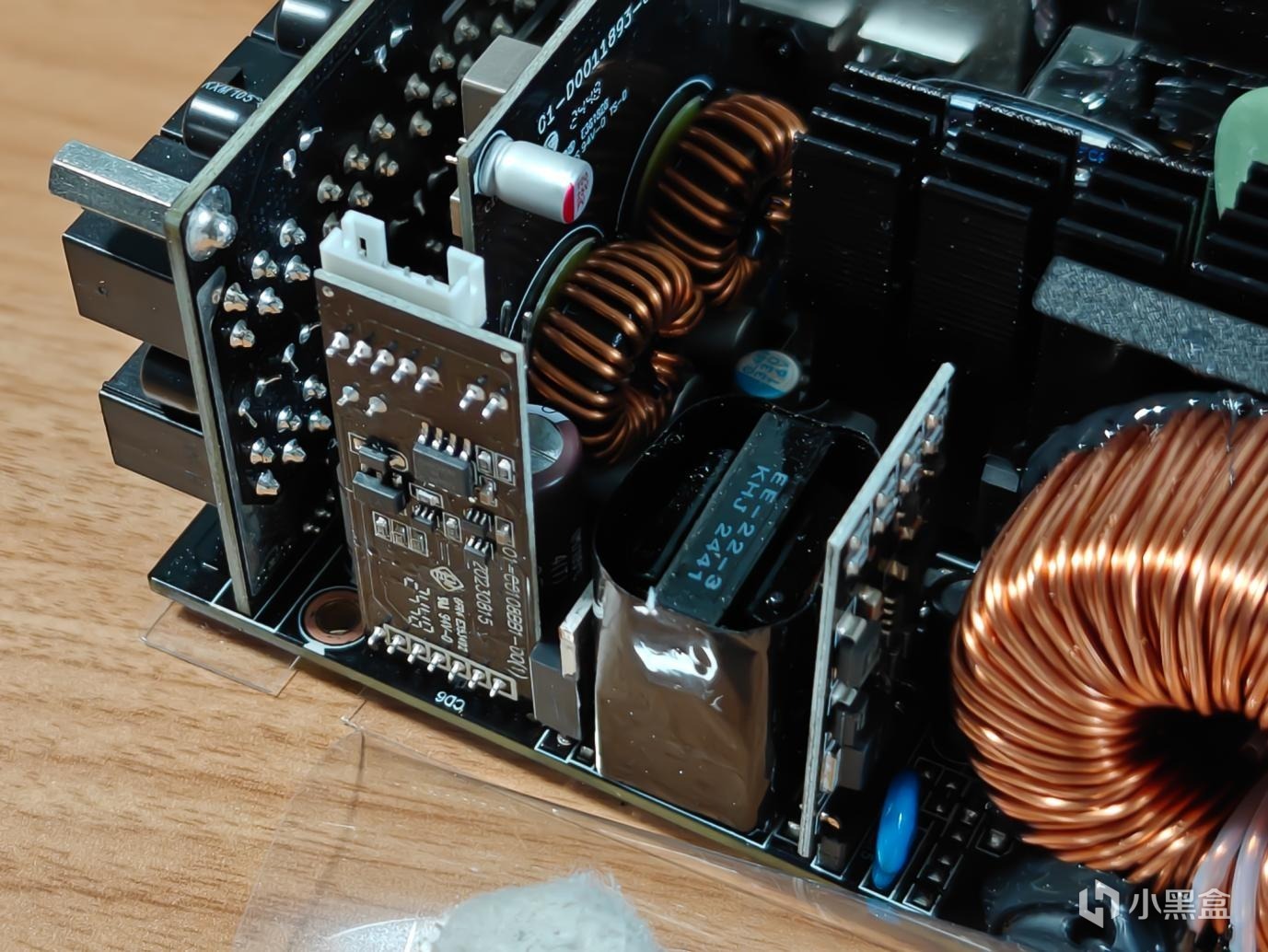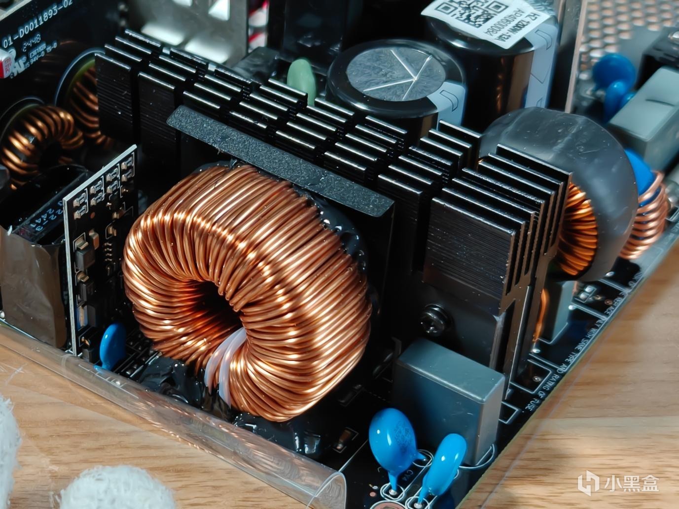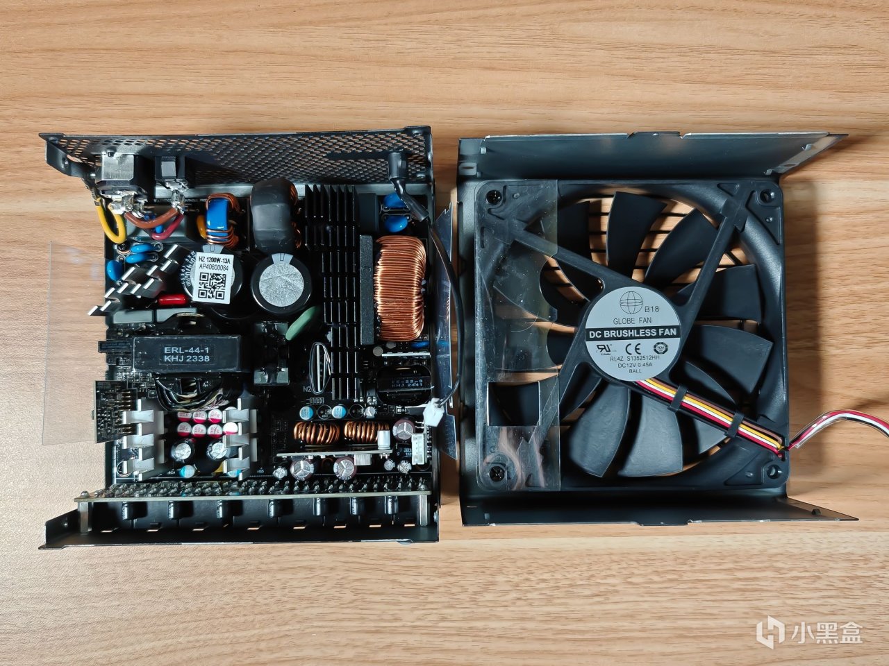 擰掉若干螺絲將電源打開,打開蓋子。帶有風扇的頂蓋一側有透明塑料,上面還有開口。這樣的設計爲了調節風向,從而得到最好的冷卻效果。電路部分非常齊整,兩側有透明塑料片隔離絕緣,電源採用了主動式PFC+全橋LLC諧振+同步整流+DC-DC結構。