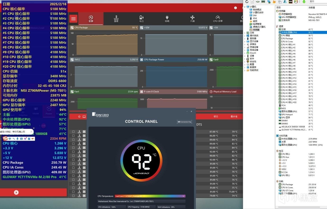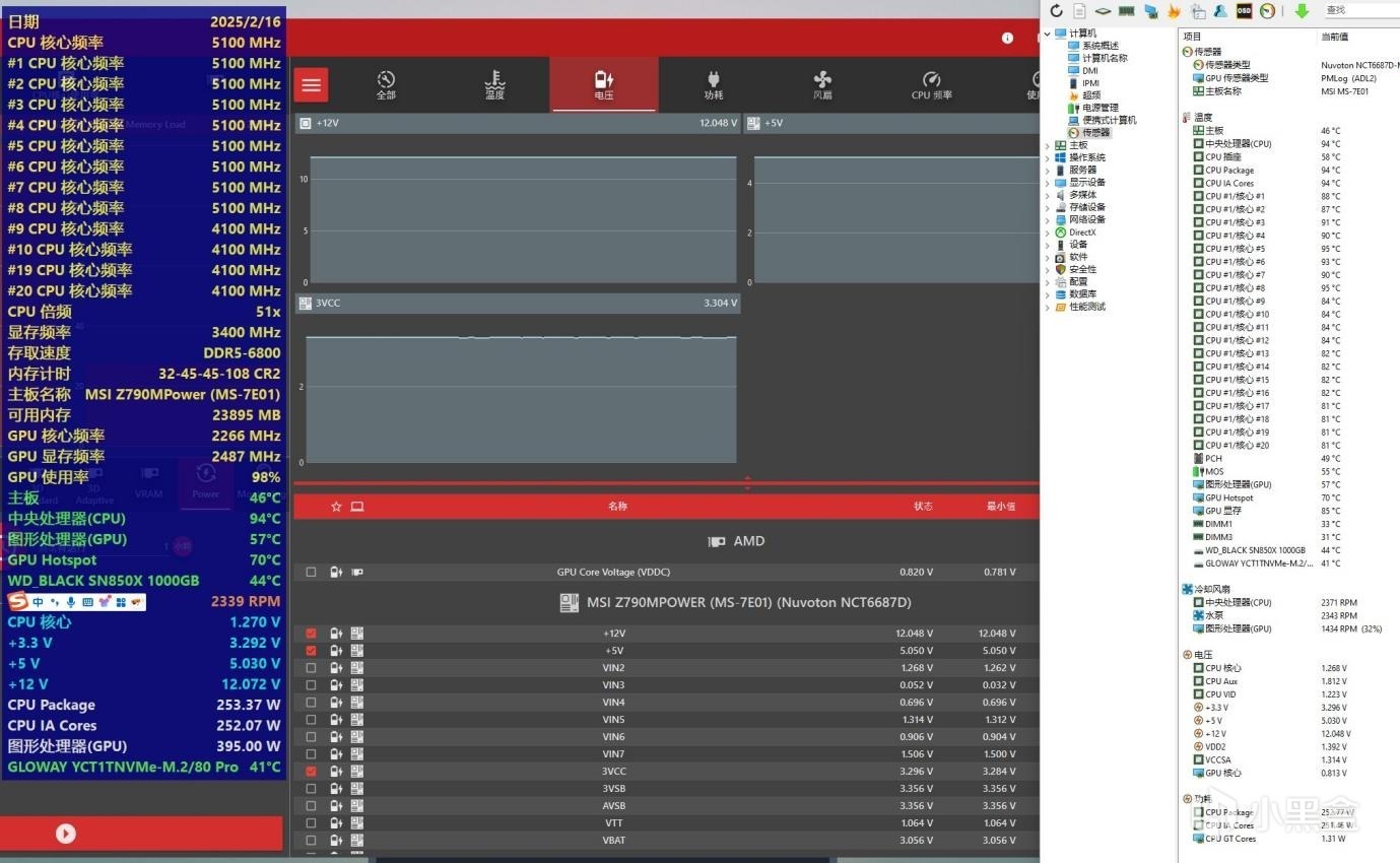 運行AIDA64 FPU 壓力測試 + 甜甜圈 壓力測試,同時跑滿CPU + GPU顯卡,我們看到CPU功耗251W,GPU功耗409W。