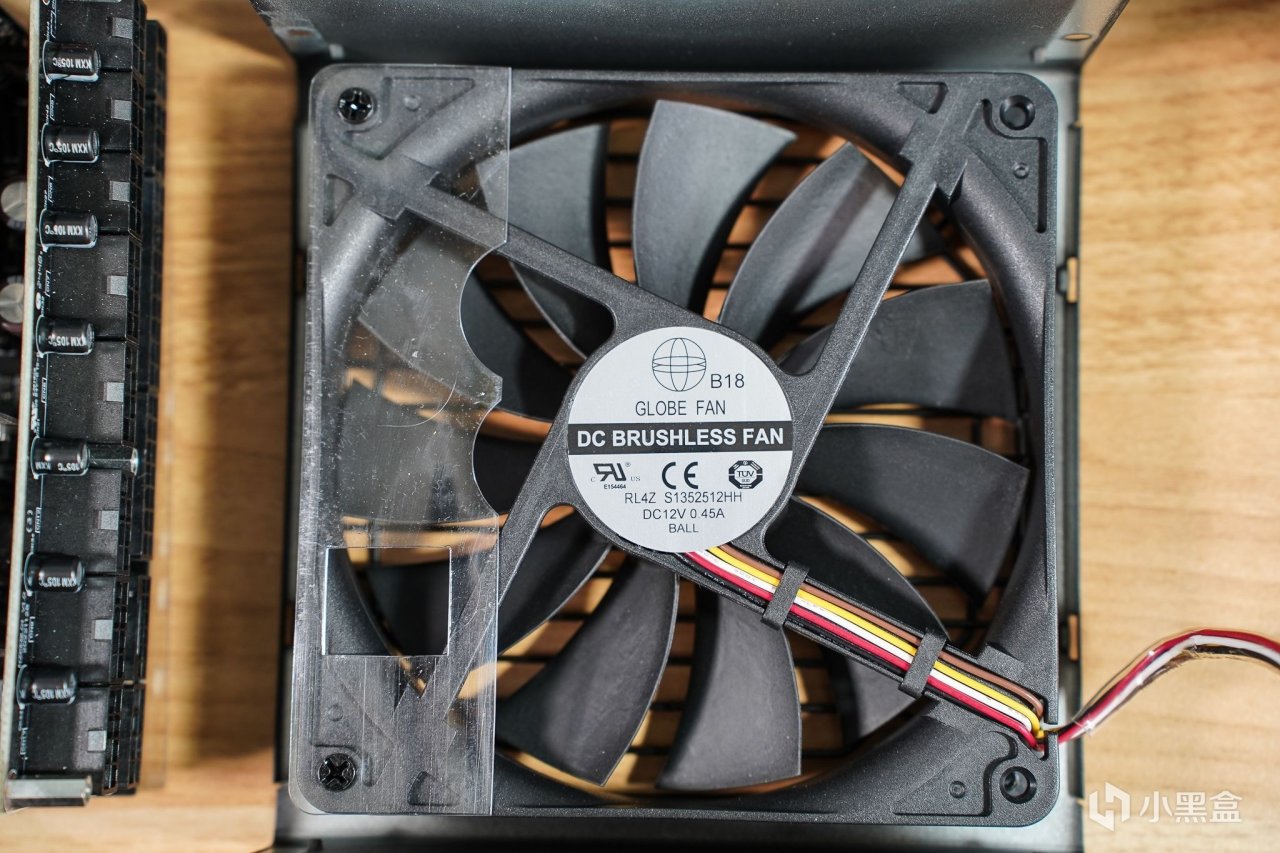 再來看看風扇,背面標籤顯示是GLOBE FAN的,型號爲RL4Z S1352512HH,直流無刷電機,12V/0.45A。這款風扇直徑135mm,11個扇葉。雙滾珠軸承風扇壽命長,噪音低。