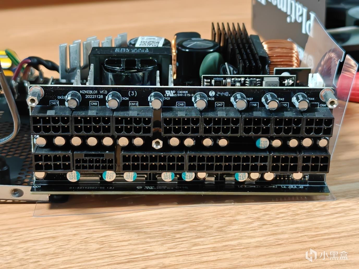 輸出模組豎向一體式,後面佈滿了許多電容,用於12V輸出和3.3V/5V輸出, 用料很足。