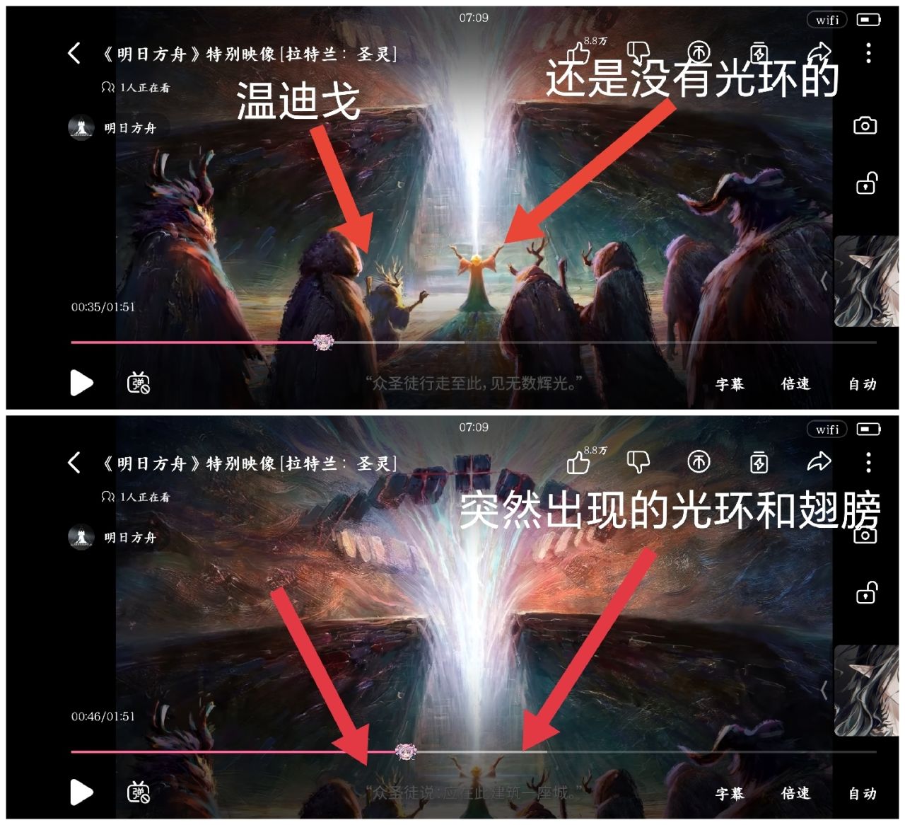 教宗所說“夜間,魔鬼的軍兵追來,戕害衆多薩科塔。”是可以完美符合視頻中薩科塔和薩卡茲戰鬥的畫面。其次,在映像視頻中“衆聖徒行走至此見無數輝光”中聖徒們還是明顯的薩卡茲角特徵,甚至能明顯看出有溫迪戈在內。下一秒的畫面角已經被全部抹除,取而代之的是光環和翅膀。