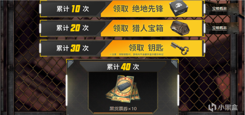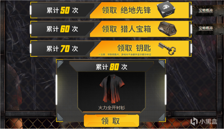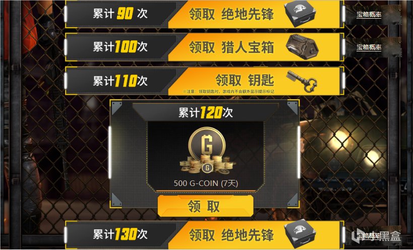 每日任務累計抽獎次數依舊可獲得大量寶箱,從累計10次開始,到累計120次,累計每個整數就可獲得絕地先鋒寶箱、獵人寶箱、鑰匙、黑貨箱票券、全新火力全開襯衫等獎勵。
