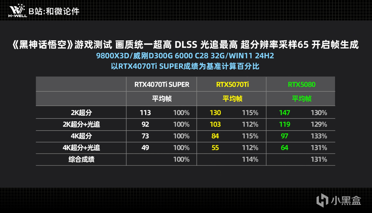 接下來是國產3A大作黑神話悟空,因爲不支持DLSS4,所以整體表現相對正常,5070Ti對比4070Ti SUPER領先幅度並不大僅14%左右,5080對比5070Ti領先約15%。