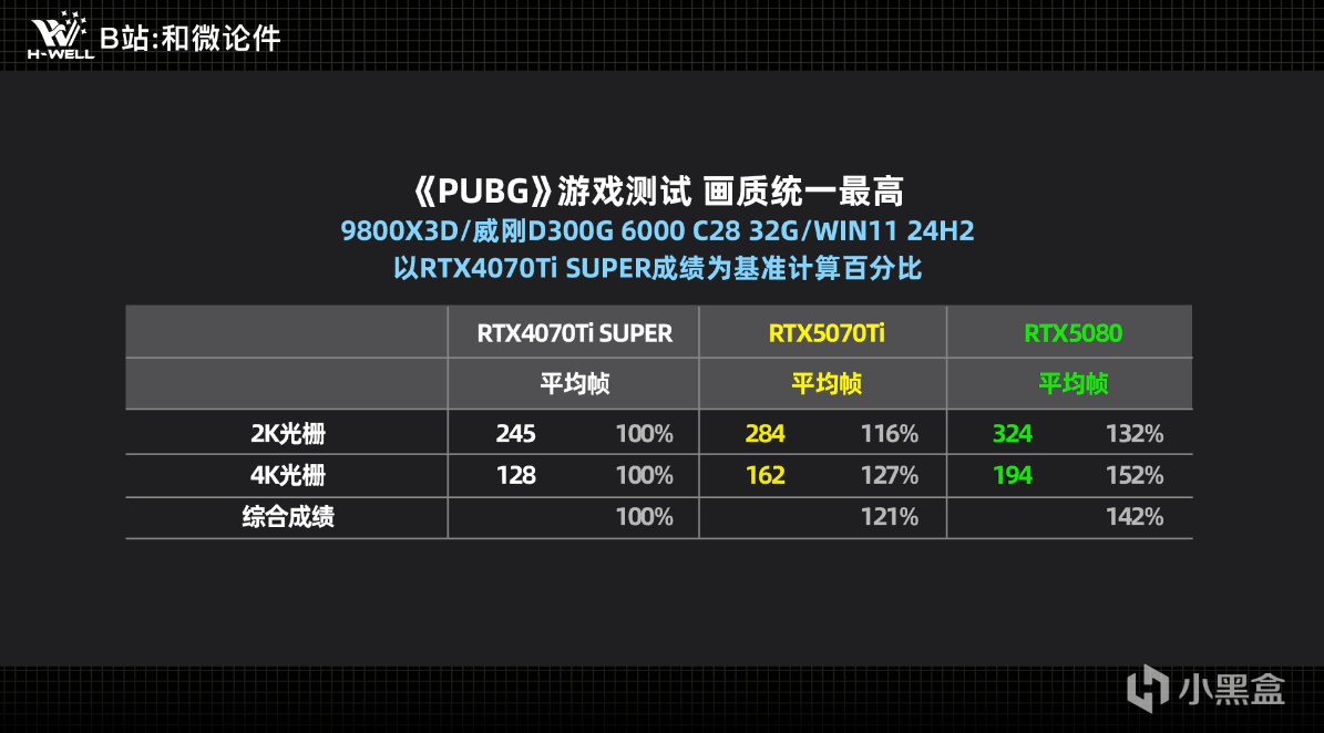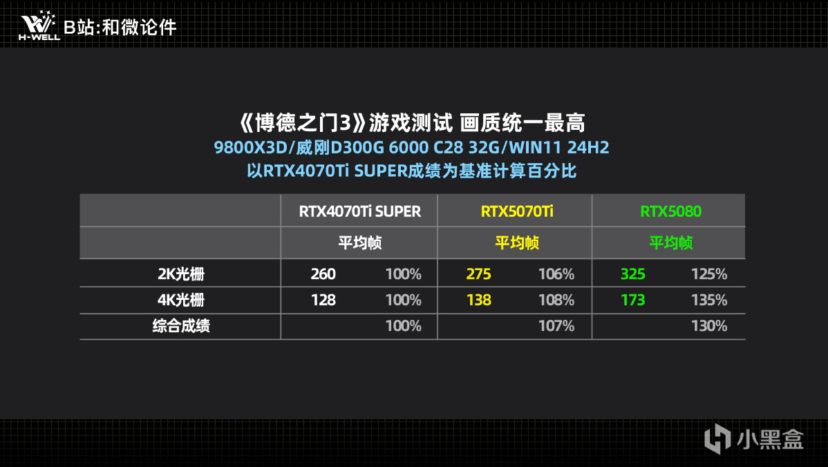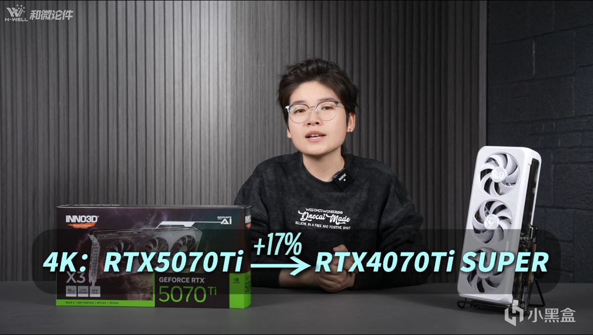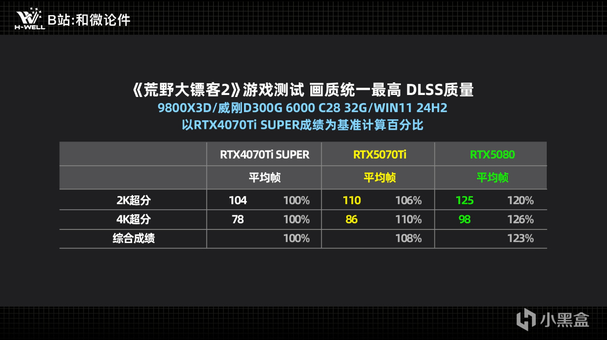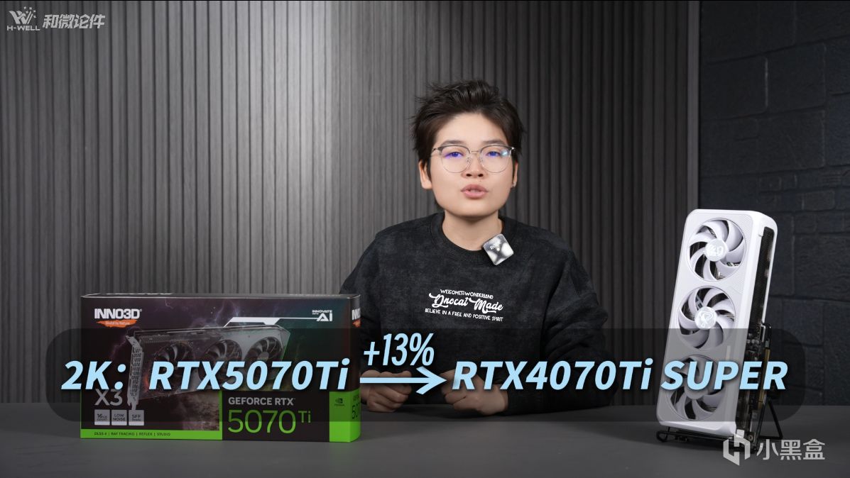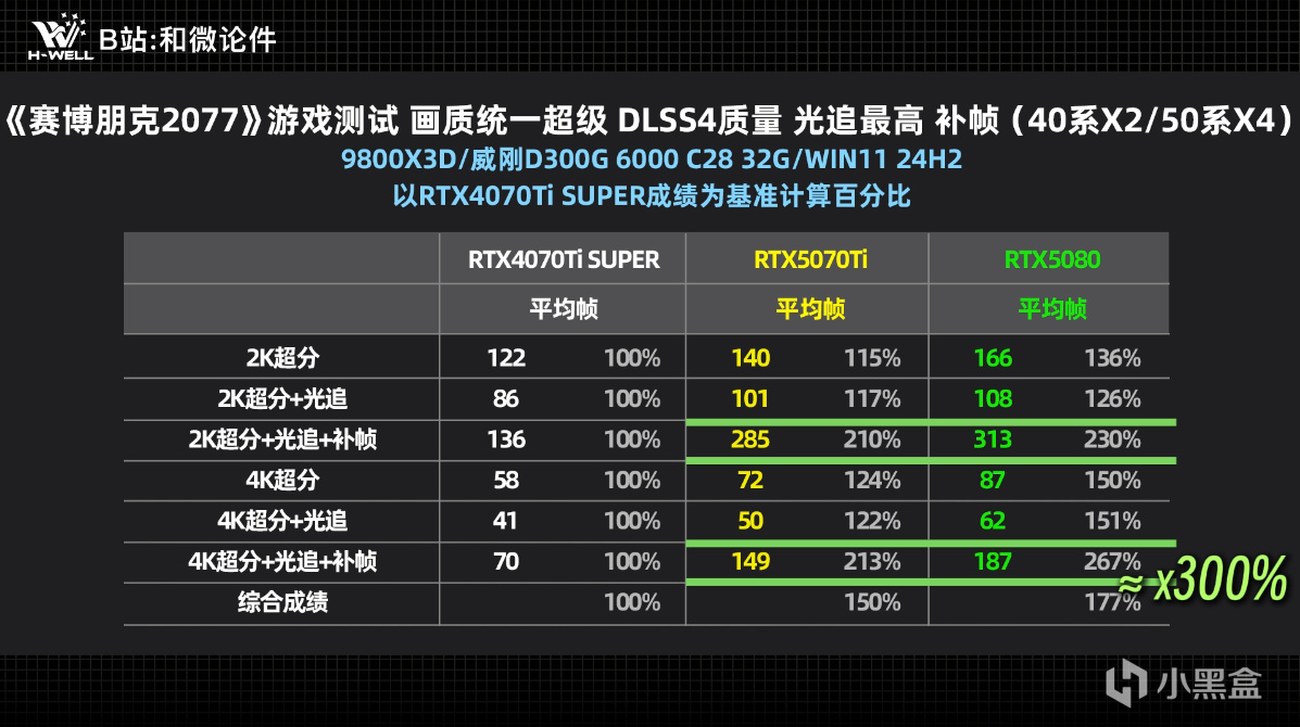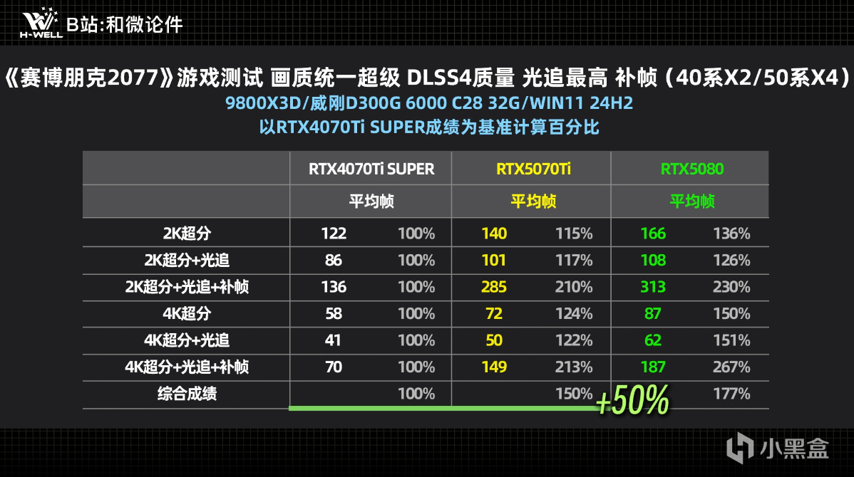 接下來是遊戲測試,一共測試了10款遊戲,包含4K和2K畫質。並且值得一提的是,在支持DLSS4遊戲當中,開啓補幀之後,5070Ti對比4070Ti SUPER幾乎翻倍吊打,不過鑑於目前支持DLSS4的遊戲還未普及,10款測試遊戲當中只有一款支持,所以計算綜合性能的時候也不算欺負人。