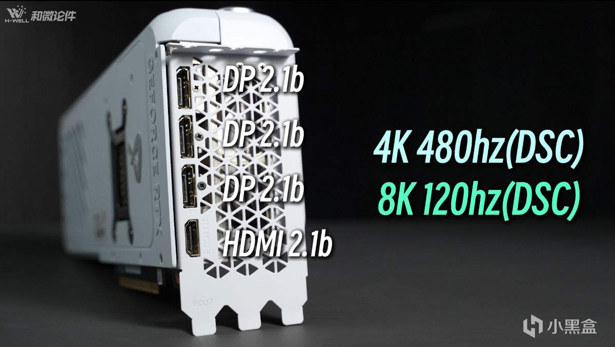 最後尾部接口,這次50系全部標配的是三個DP 2.1b和一個HDMI 2.1b,搭配DSC技術的顯示器,最高可以實現4K/480Hz和8K/120Hz的視頻輸出。