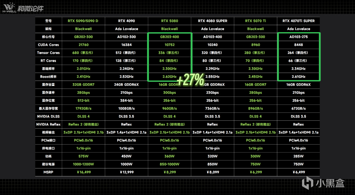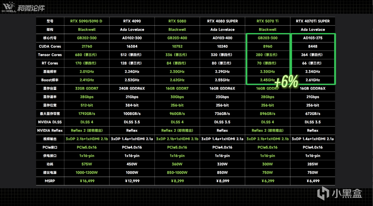 而5070Ti對比4070Ti SUPER領先了6%,其他方面對於性能影響比較大的,還有DLSS4和GDDR7顯存的優勢,重要數據不多,這幾條大家可以先記一下,作爲參考標的。