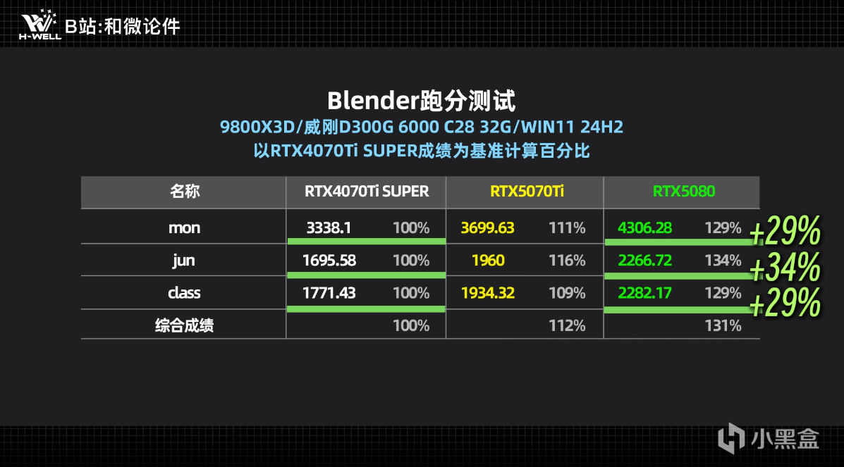 5080分別是29%/34%/29%,綜合領先約31%;5080直接對比5070Ti則領先約17%,這裏生產力的表現5070Ti還是不如4080S的,畢竟單看CUDA核心數量,5070Ti是要少於4080 SUPER的。