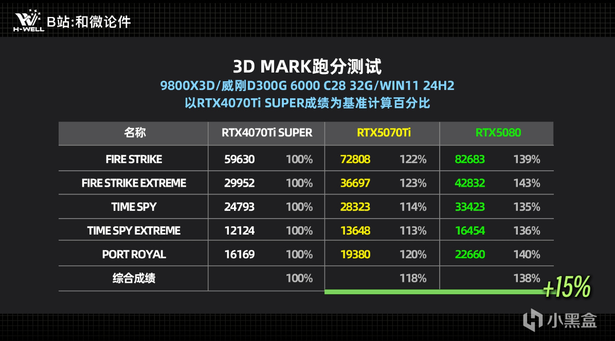 代表光追性能的PORT ROYAL,5070Ti領先20%,5080領先40%;綜合來看,5070Ti領先4070Ti SUPER約18%,5080領先約38%,而5080直接對比5070Ti的話領先約15%,單從理論性能來看,5070Ti已經基本和4080 SUPER持平。