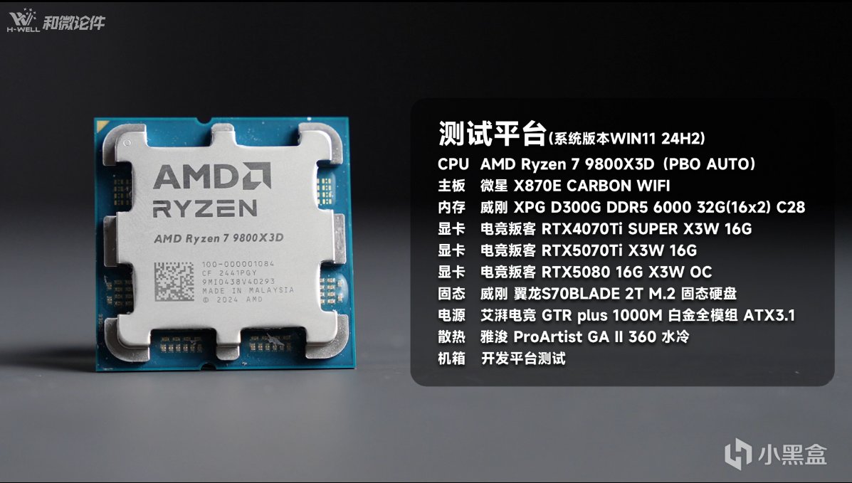 接下來看下性能實測,爲了方便大家更直觀瞭解5070Ti的性能定位,我們拿來電競叛客的RTX5080 16G X3W OC,和上一代的RTX4070Ti SUPER X3W 16G進行對比,測試平臺如圖,CPU選用目前遊戲天花板R7 9800X3D,避免瓶頸,統一開啓PBO AUTO進行測試;