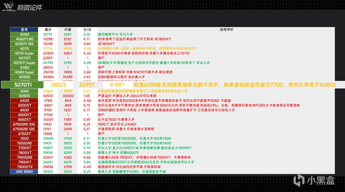 至於5070Ti值不值得購買?根據咱們上期顯卡不能碰的最新情況來做判斷的話,以4070Ti SUPER/4080 SUPER的TIME SPY跑分,除以這兩款顯卡目前5749/ 7899左右的基礎版型號市場價,可以得出這兩款顯卡最新的性價比參數爲4.28和3.68,假設5070Ti原價6299大量供應,那麼性價比指數將來到非常誇張的4.49,僅次於N卡中性價比排名第一的4060,並且還額外多個具有顛覆屬性的DLSS4加持,屬於剛需抽耳光也要入手的程度;但是如果基礎版型號溢價來到7700以上,性價比指數將低於目前4080S的3.68,更不用提4070Ti SUPER高達4.28的性價比指數了,5070Ti這張卡是否能碰我覺得就需要深思熟慮一番了。