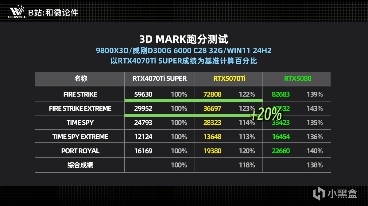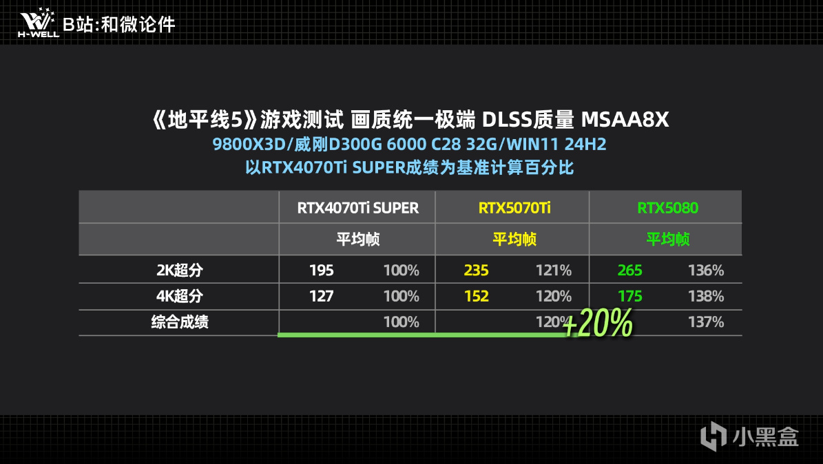 表現相對好點的,地平線5算一個,5070Ti領先4070Ti SUPER約20%,5080領先5070Ti約14%;COD20表現略有差異,5070Ti領先4070Ti SUPER約11%,5080領先5070Ti約19%。