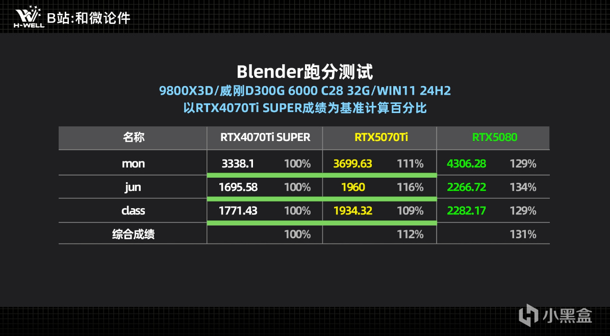 而在三維動畫製作軟件Blender測試中,5070Ti三項成績分別領先4070Ti SUPER 11%/16%/9%,綜合領先約112%,