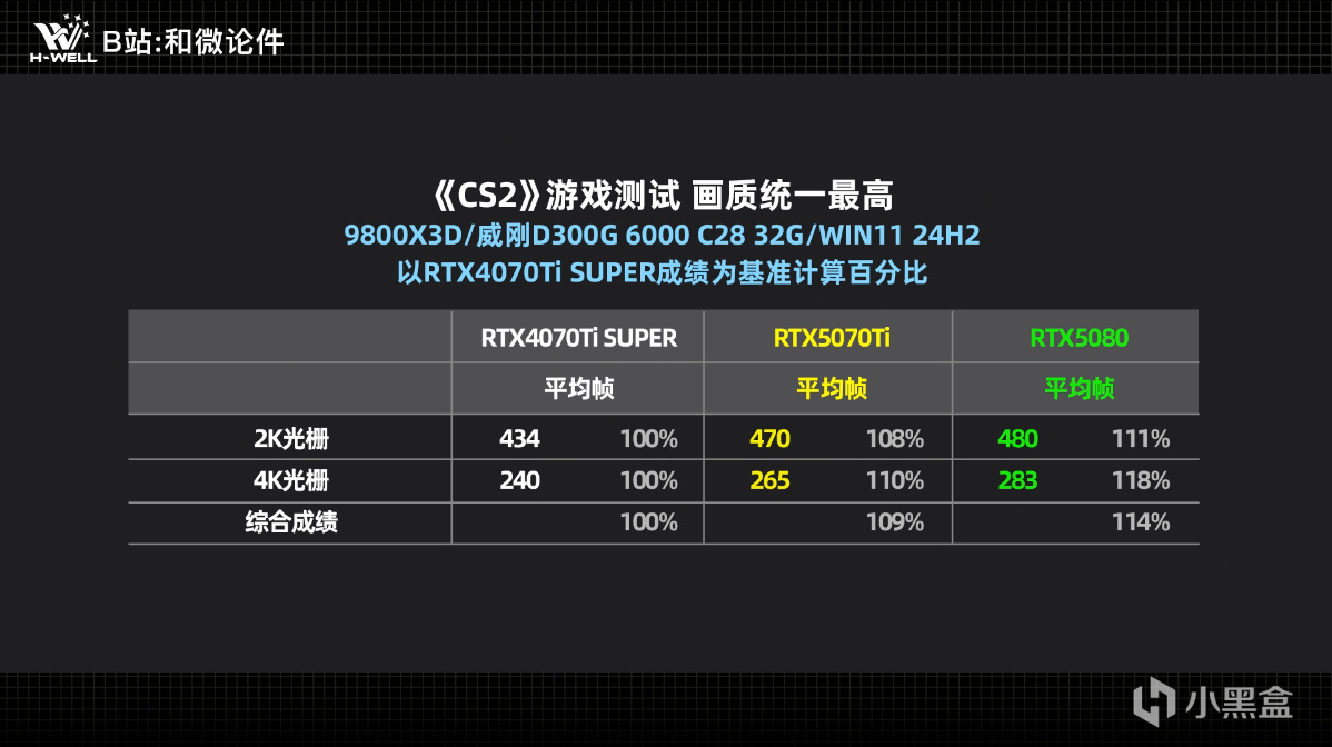 然後是主流網遊CS2,不支持DLSS和光追,純看光柵性能和遊戲優化,5070Ti對比4070Ti SUPER領先幅度僅9%左右,5080對比5070Ti領先約4%,說實話如果你是主玩CS2的,完全不用急着考慮50系顯卡。